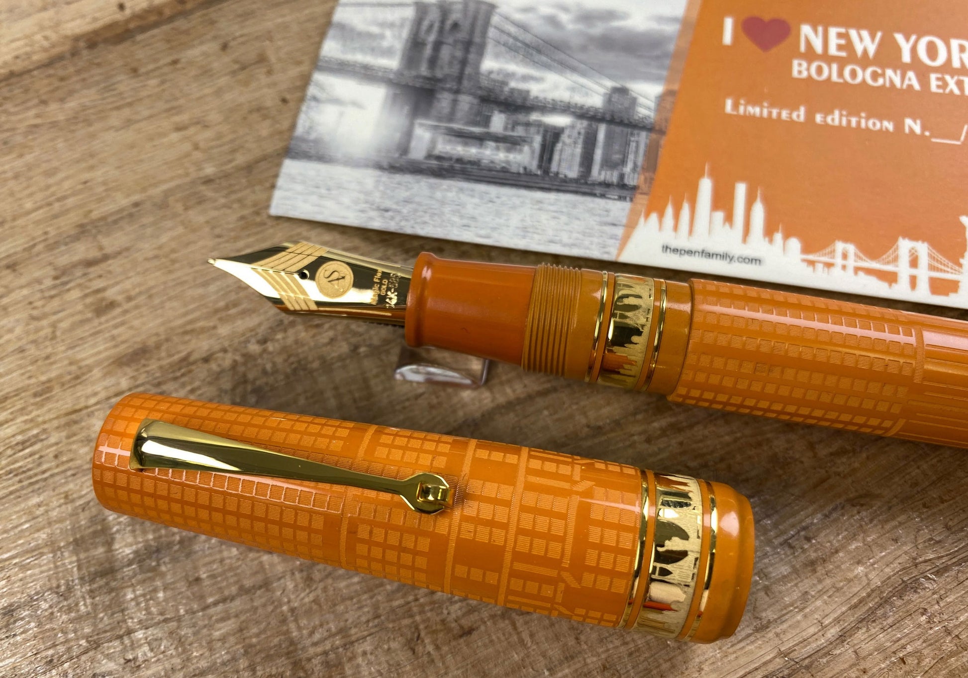 The ASC Bologna Extra "I Love New York" Chrysler Building Chased Orange Ebonite Gold features a stunning etched motif of this iconic art deco skyscraper. Being produced in only twenty-five numbered pieces worldwide, it is provided with a high capacity compressor filling system and your choice of 14k Magicflex nib in Fine, Medium, or stock Stub.