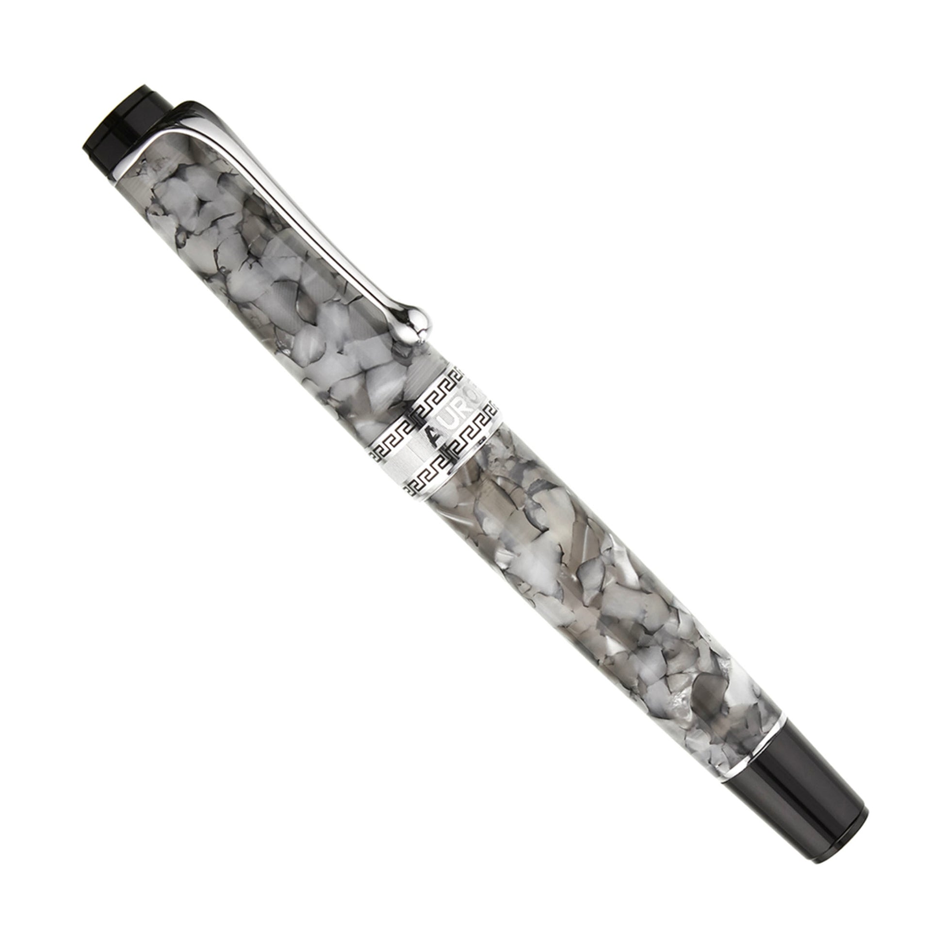The Aurora Optima Nero Perla fountain pen is a celluloid stunner in shades of grey. The rhodium trim and black cap ends accentuate the cool, mosaic pattern of the pearlescent celluloid.