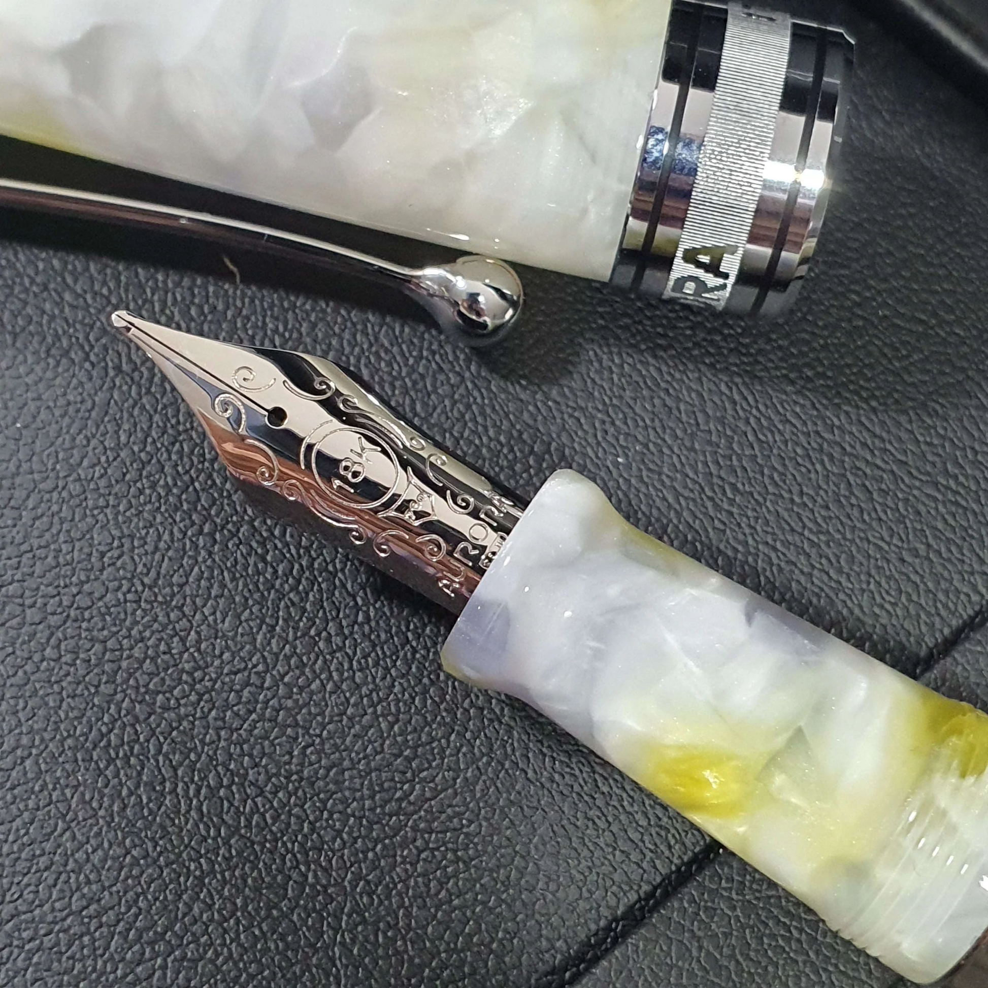 Hand-assembled in Italy, this pen's body has been created in white, yellow, and lilac marbled Auroloide, Aurora's proprietary cellulose acetate material. Aurora's high capacity piston-fill system allows for the use of any bottled fountain pen ink.