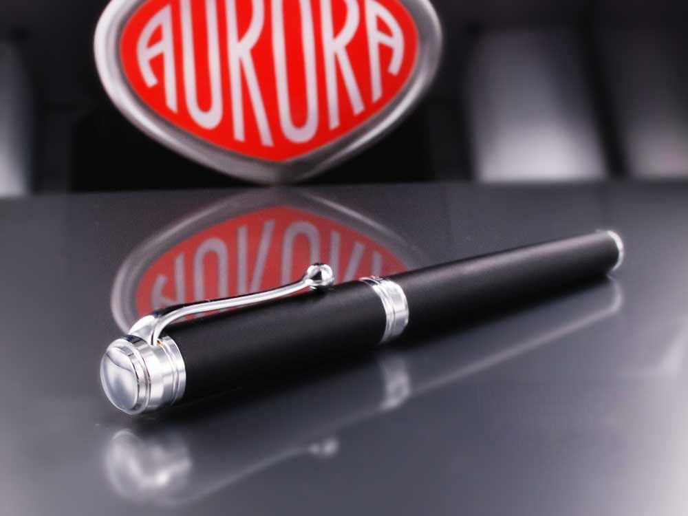 The Aurora Talentum Finesse Black Rubber with chrome trim fountain pen arrives in an elegant presentation box.