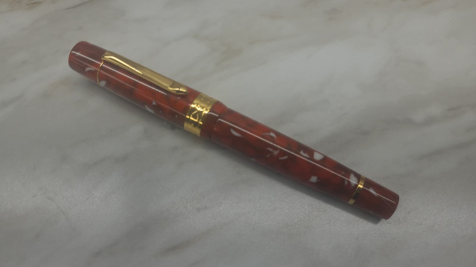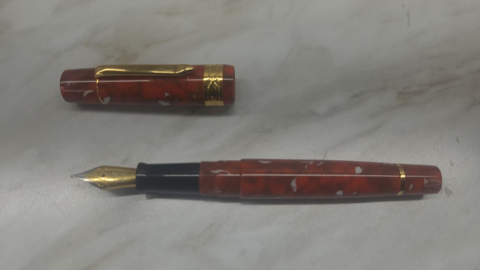 This striking Bexley Admiral fountain pen features a distinctive custom resin blend of orange and white, creating a bold yet refined marbled finish. Fitted with a broad steel nib, it offers reliable everyday writing performance. The pen uses a cartridge/converter filling system and comes with its original box and papers.
