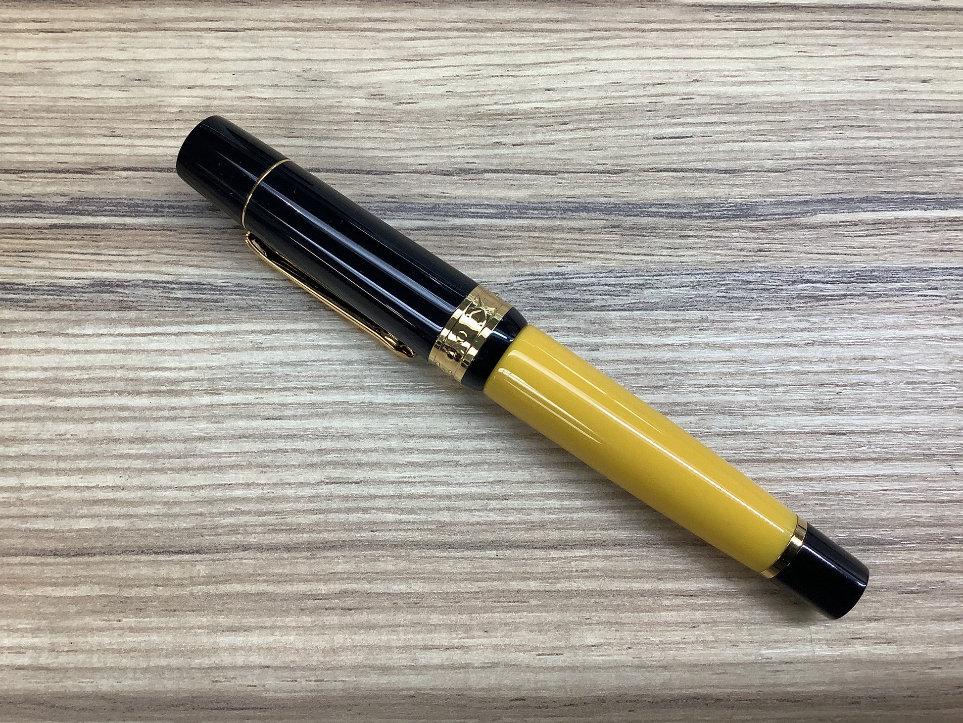 The Tea Time Yellow model features a mandarin yellow resin that captures light beautifully. Fitted with a 14k two-tone gold nib, this pen delivers a smooth, responsive writing experience. Its vibrant color and classic Bexley shape make it a standout piece from the 1993–2013 production era. Cartridge/converter filling system (converter included).
