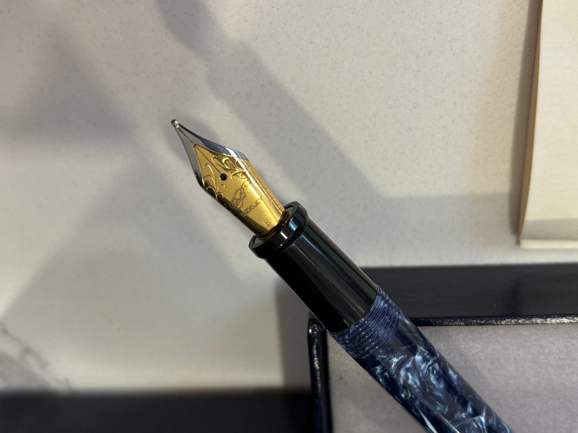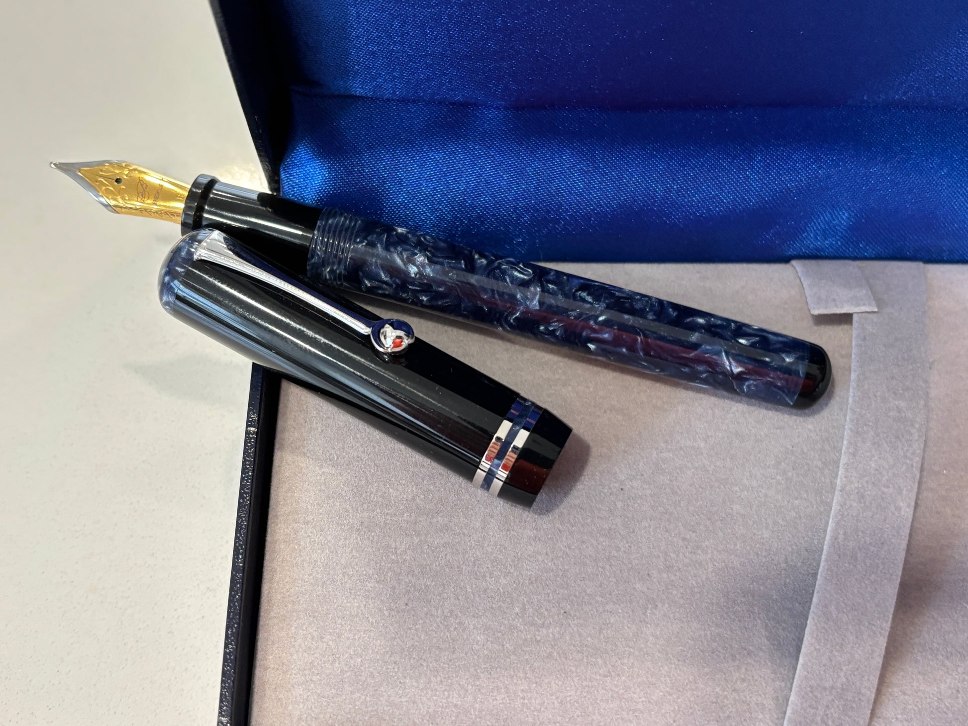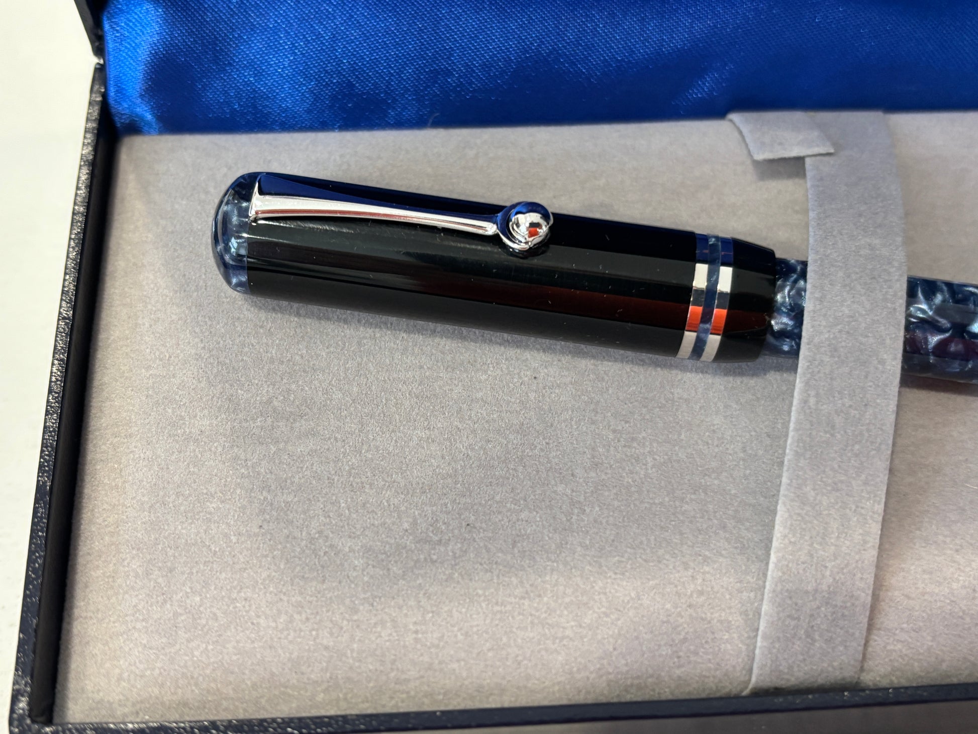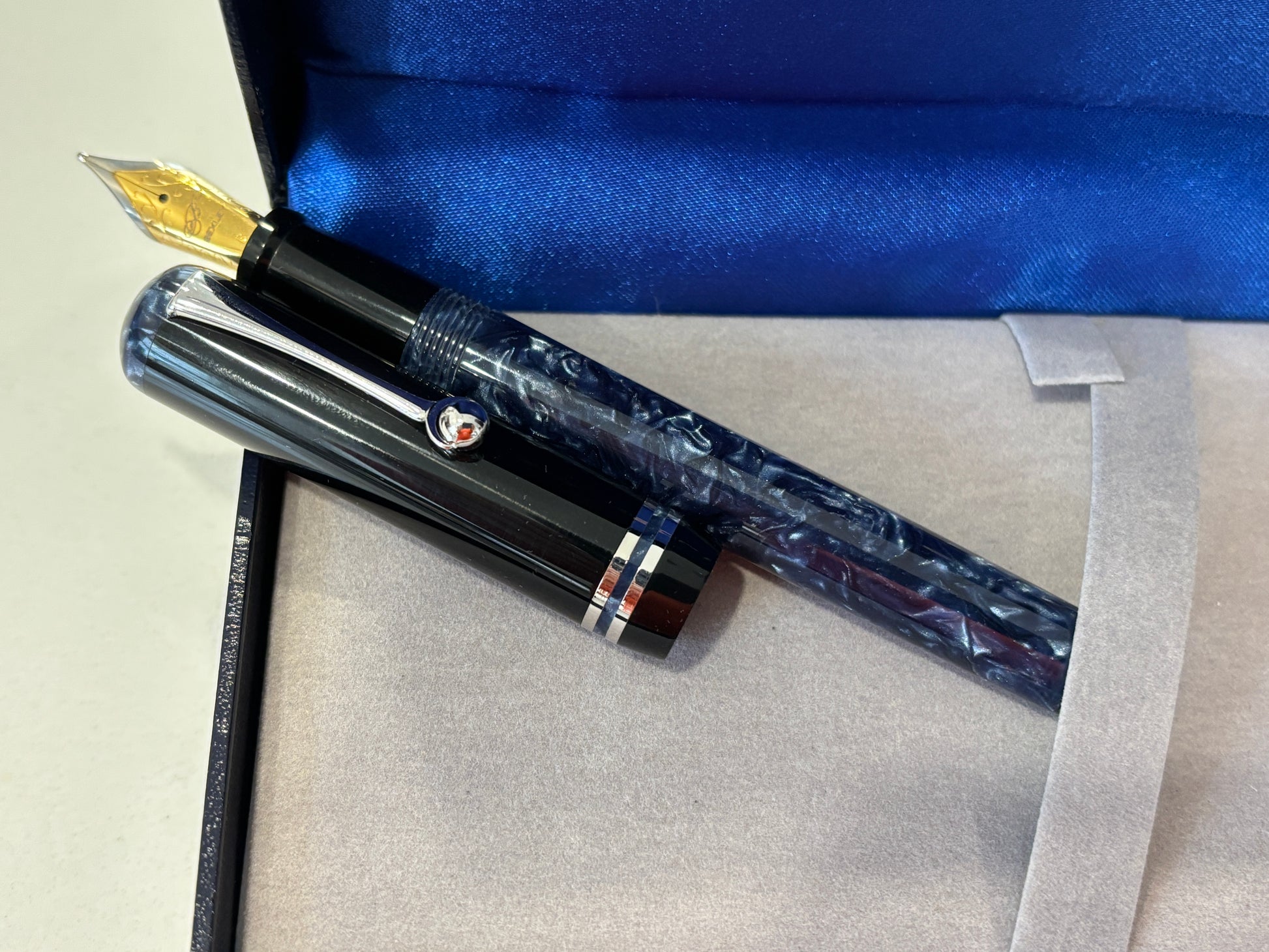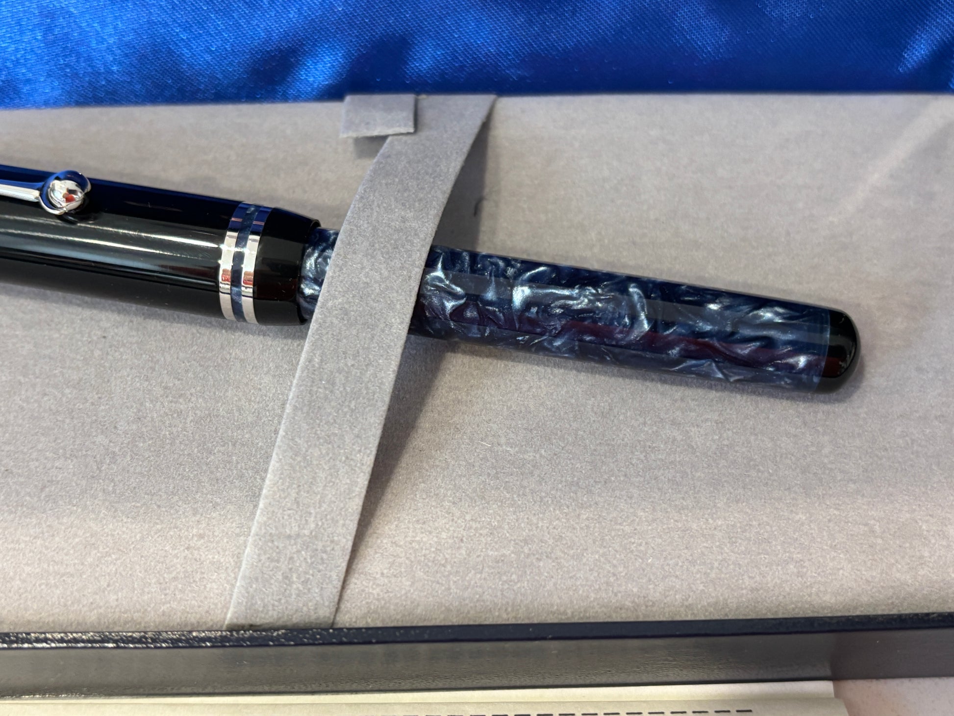 From the Ohio Cities Collection, this Batavia Blue Velvet fountain pen features a striking deep blue marbled resin accented with rhodium trim. Fitted with a Broad (B) Two-Tone steel nib, it offers a smooth and expressive writing experience.