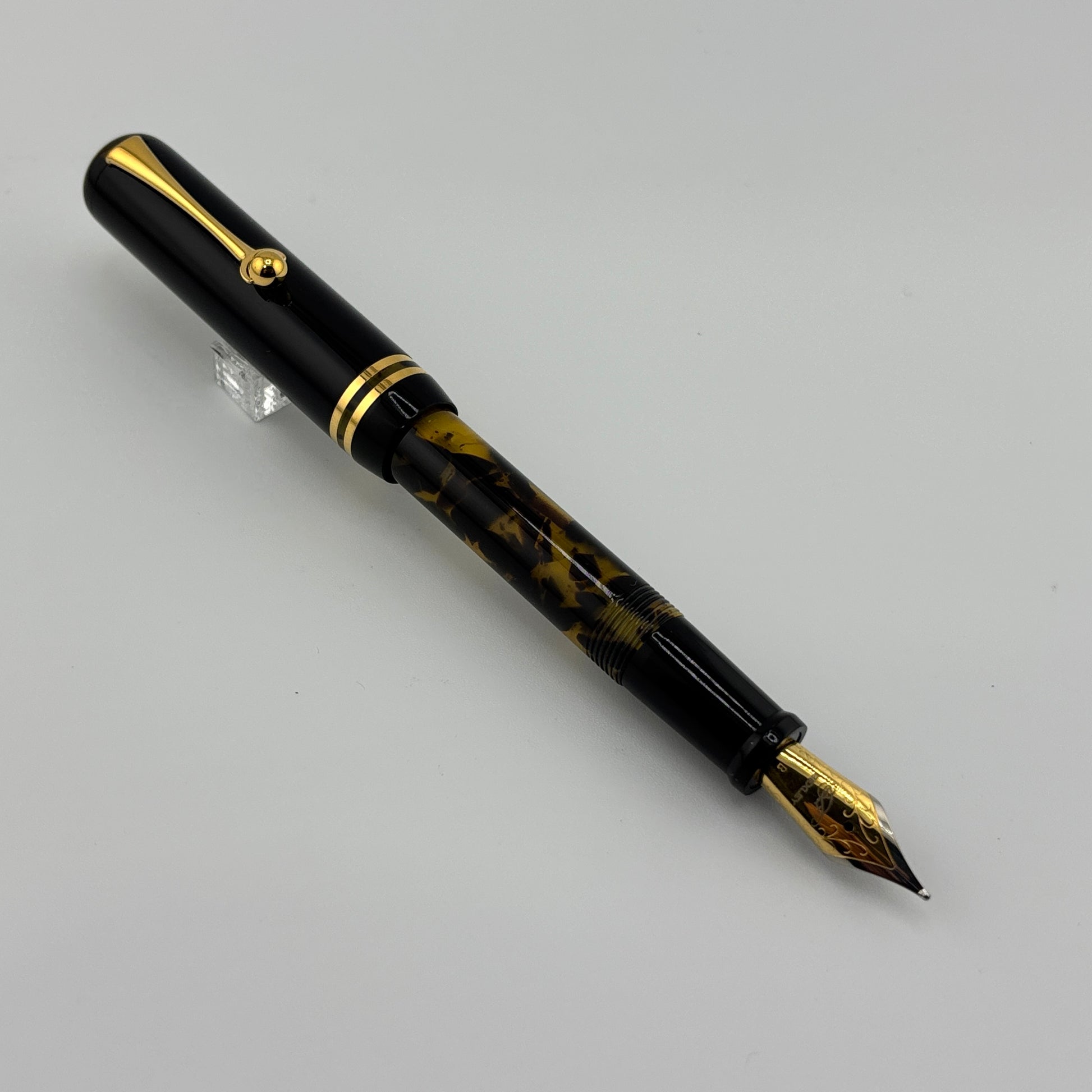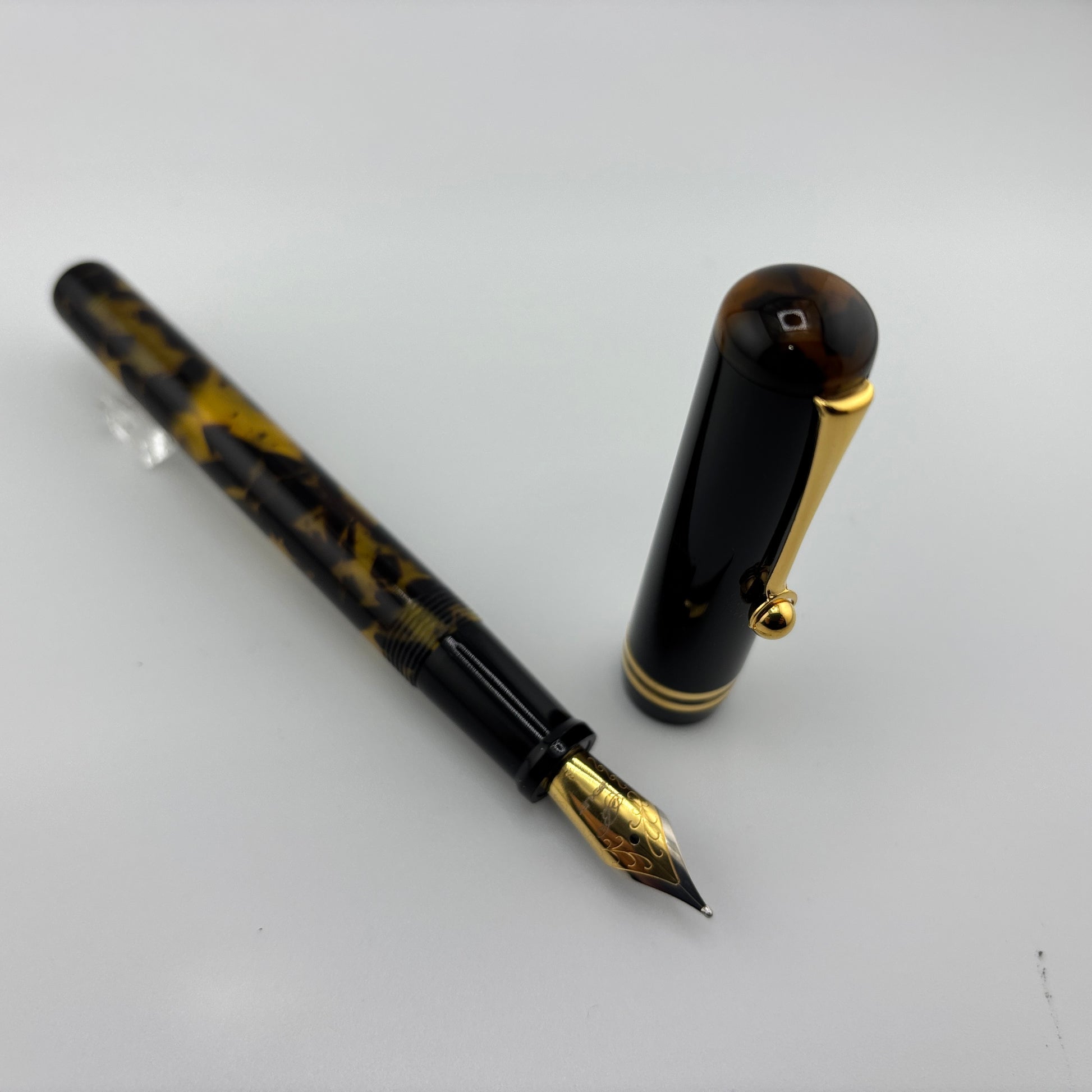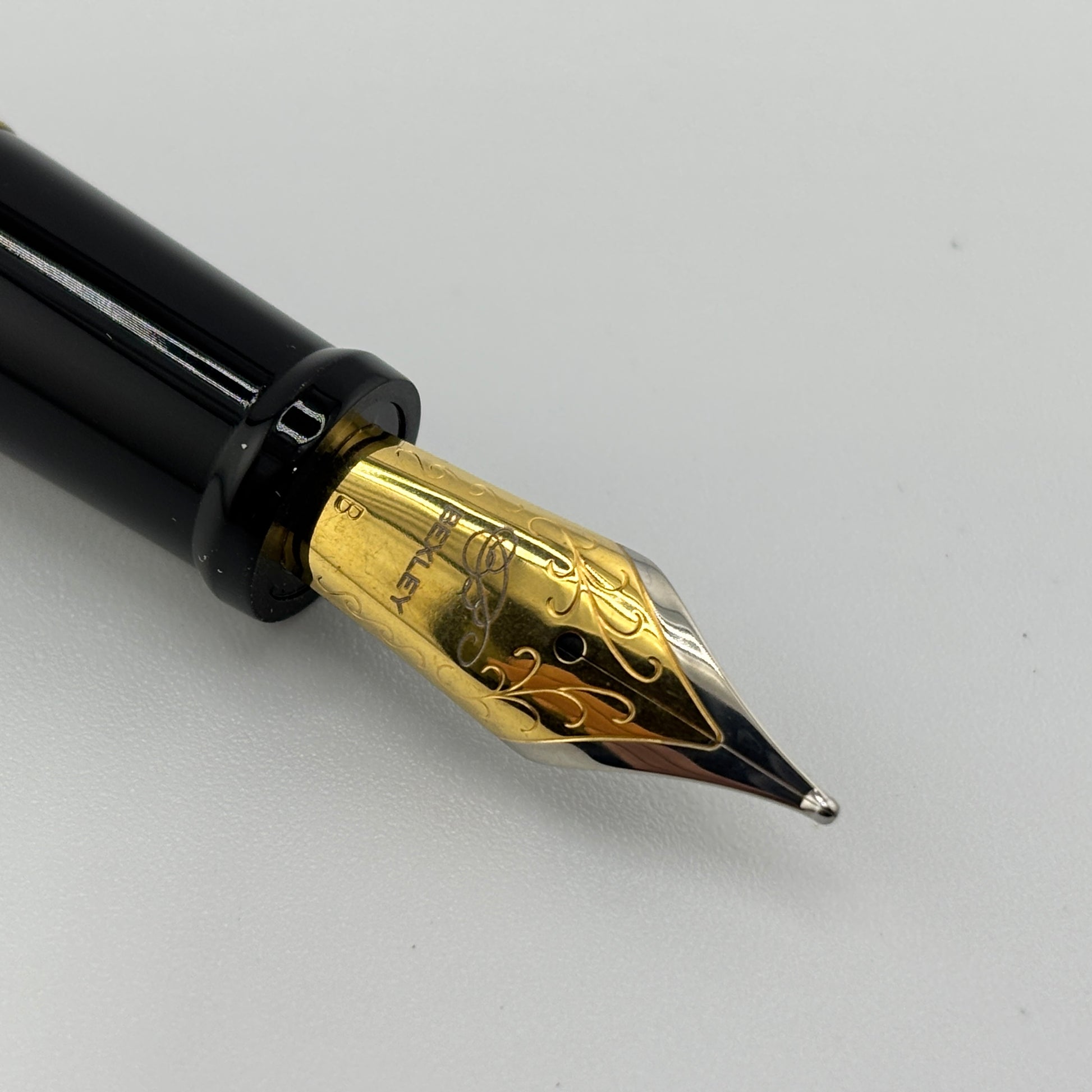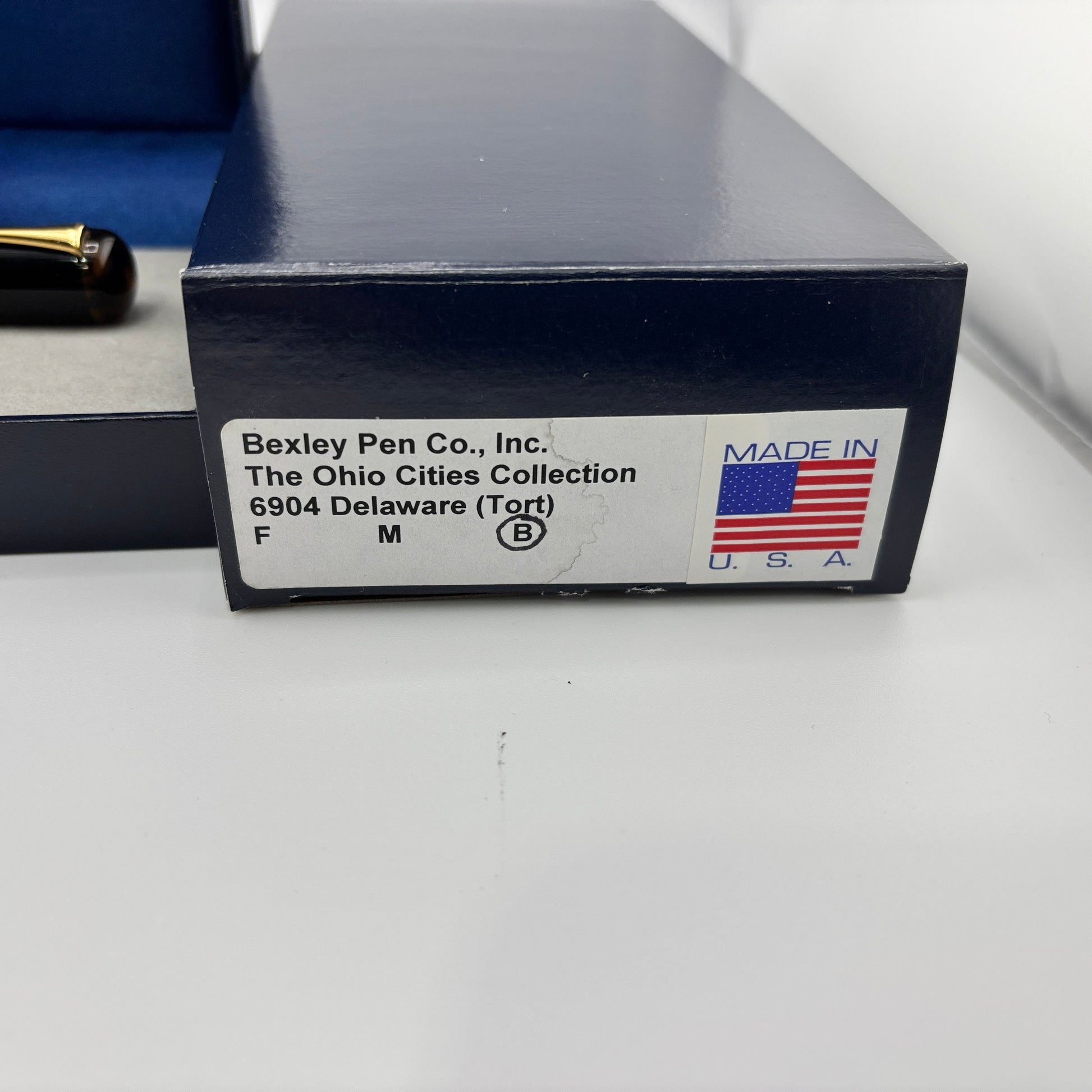 Produced around 2010, the Bexley "The Ohio Cities" Delaware in Tortoise finish features elegant gold trim and a two-tone steel broad nib, delivering a smooth and expressive writing experience. It uses a converter filling system and includes a roller converter for added versatility. A classic design with a bold, vintage appeal.