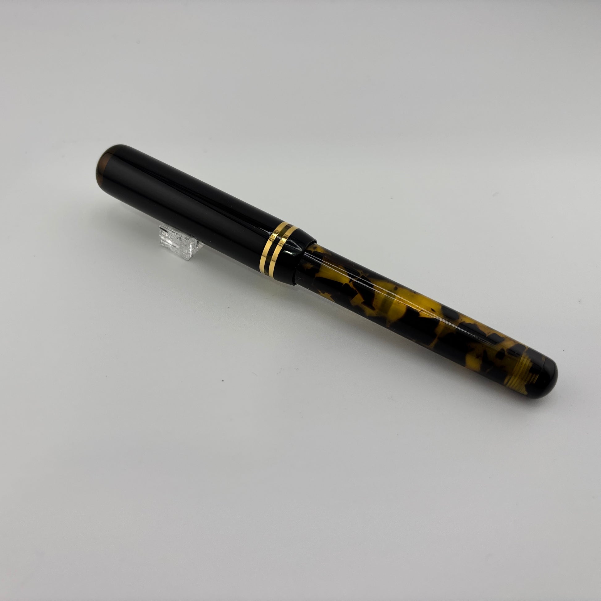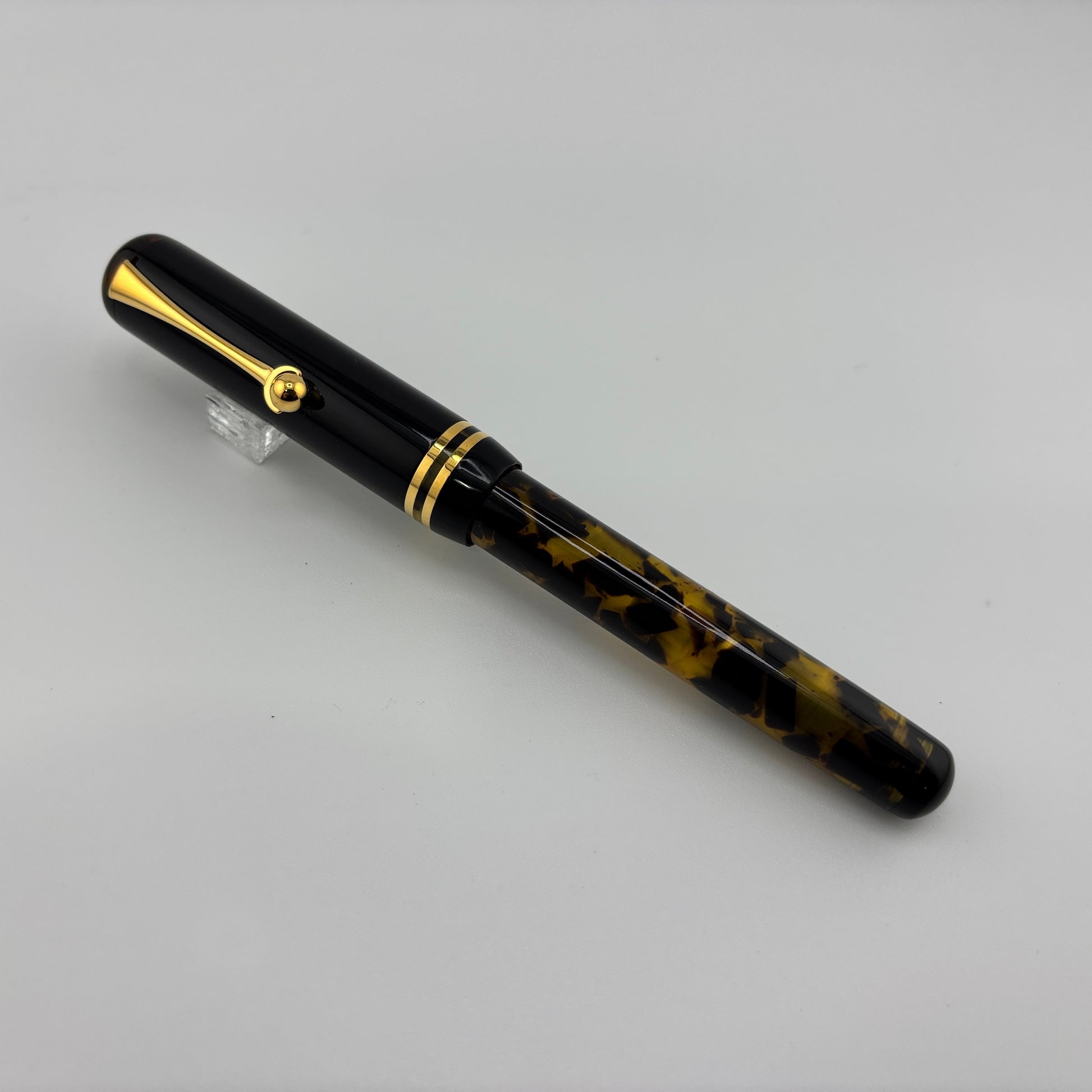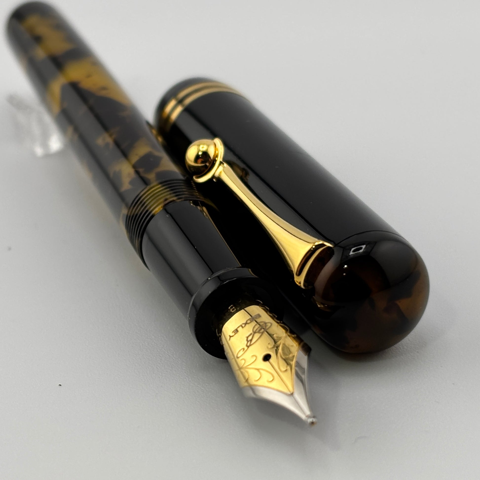 Produced around 2010, the Bexley "The Ohio Cities" Delaware in Tortoise finish features elegant gold trim and a two-tone steel broad nib, delivering a smooth and expressive writing experience. It uses a converter filling system and includes a roller converter for added versatility. A classic design with a bold, vintage appeal.