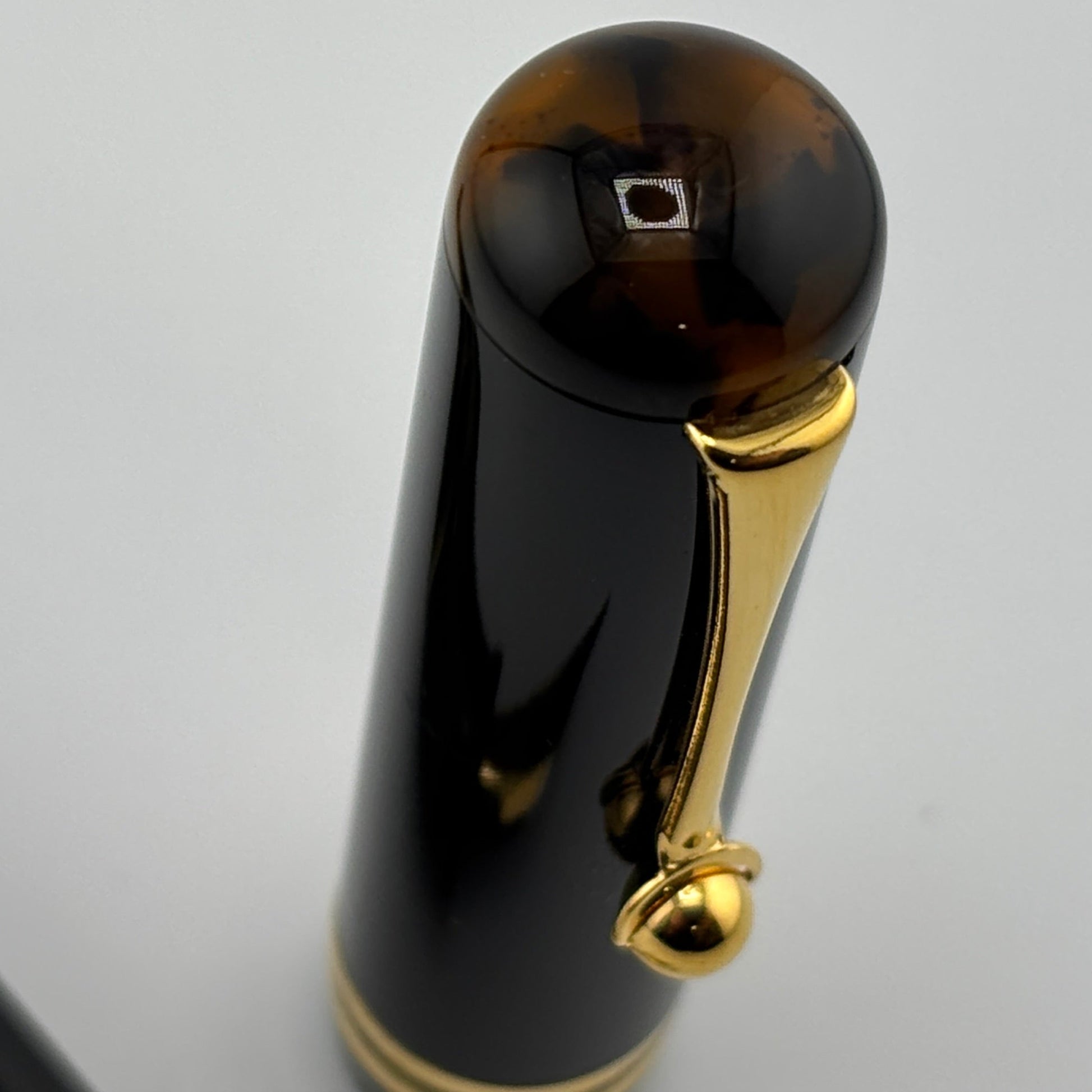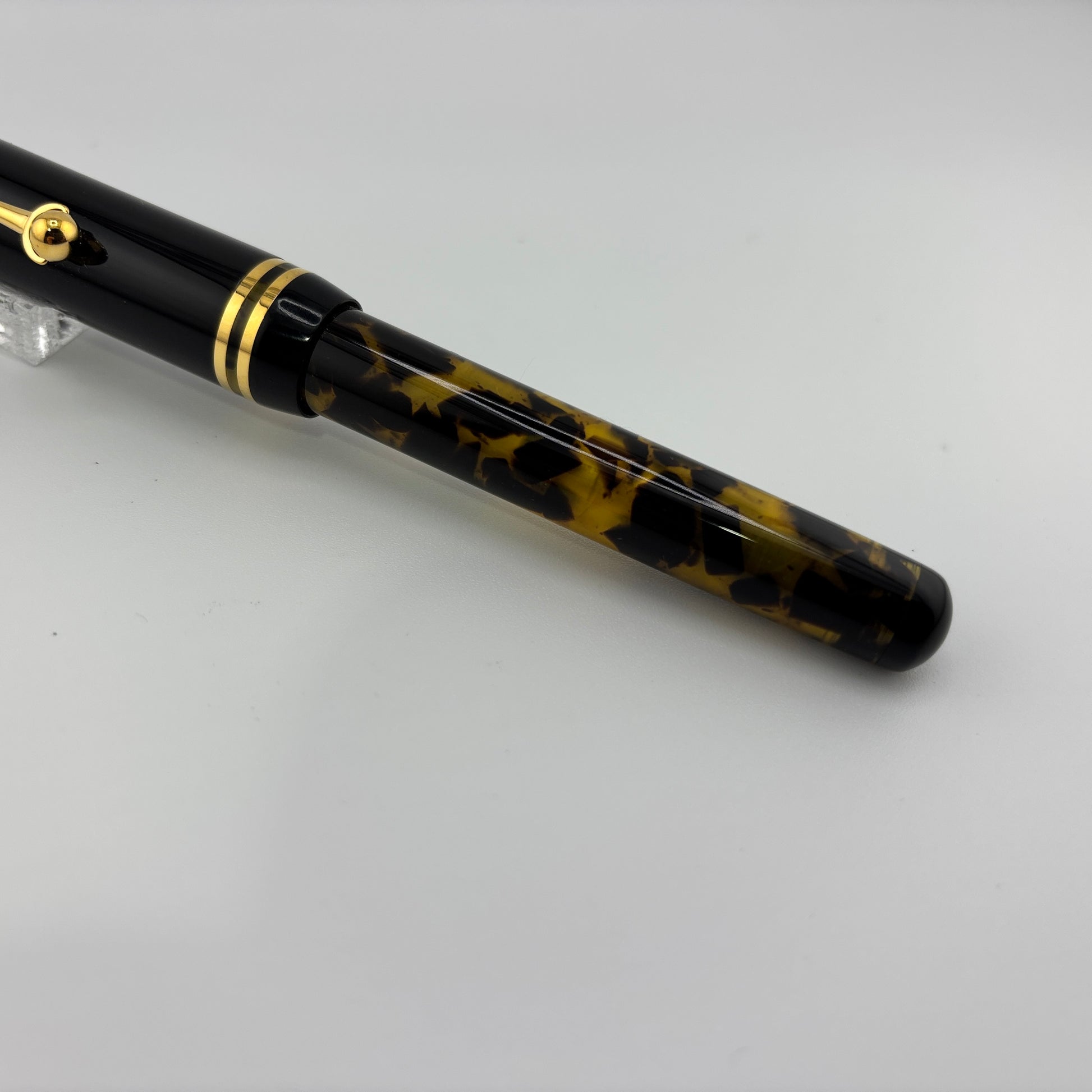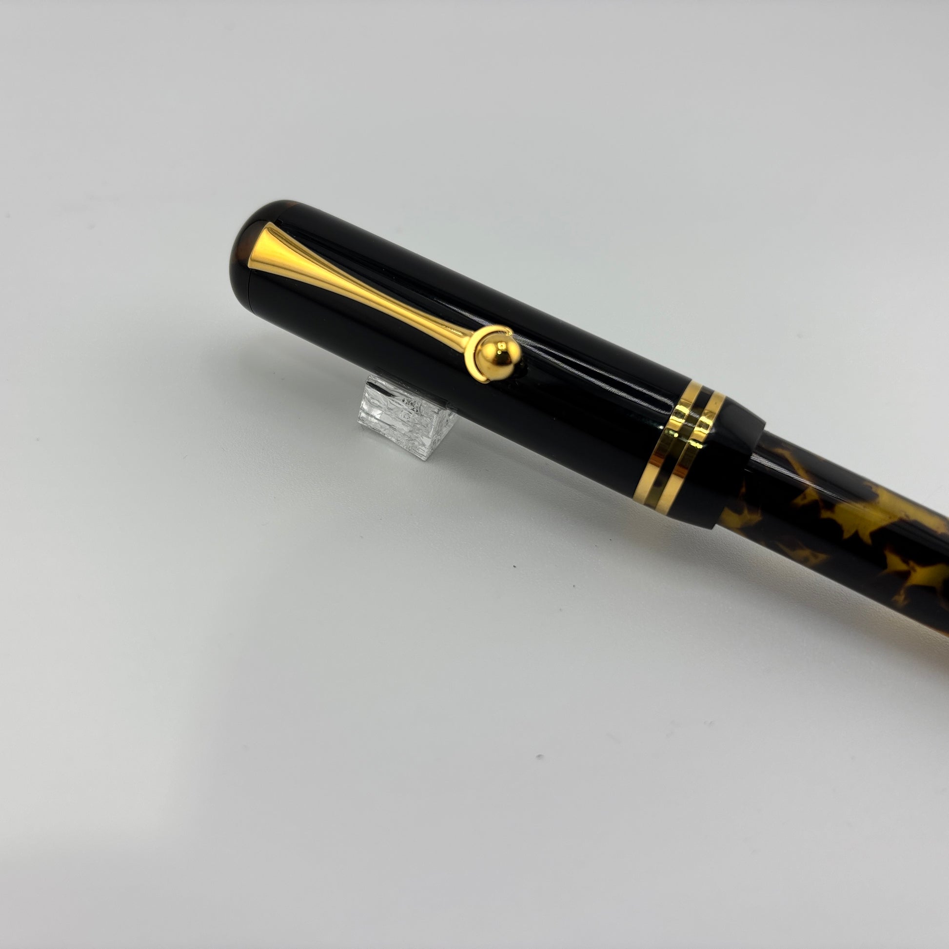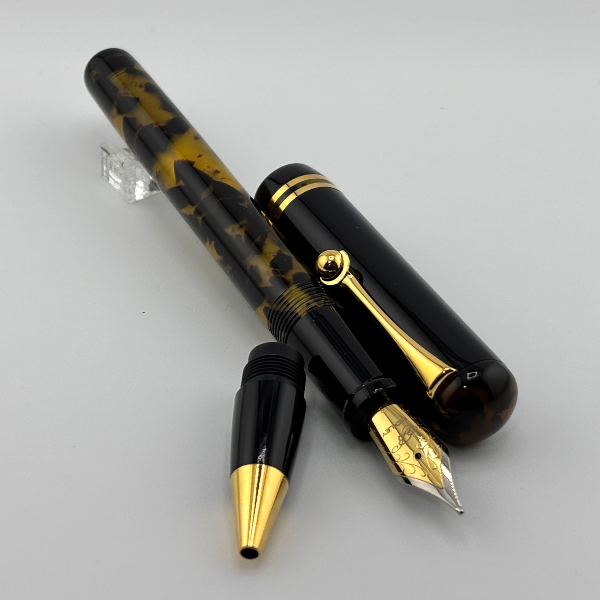 Produced around 2010, the Bexley "The Ohio Cities" Delaware in Tortoise finish features elegant gold trim and a two-tone steel broad nib, delivering a smooth and expressive writing experience. It uses a converter filling system and includes a roller converter for added versatility. A classic design with a bold, vintage appeal.
