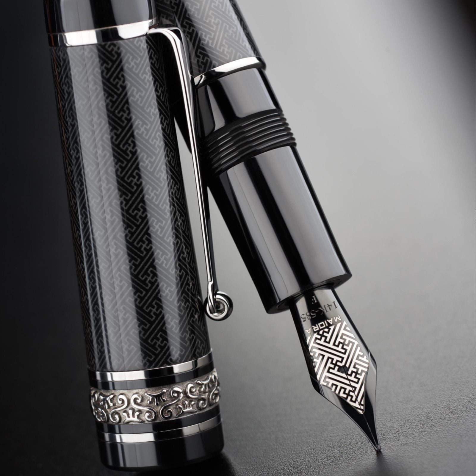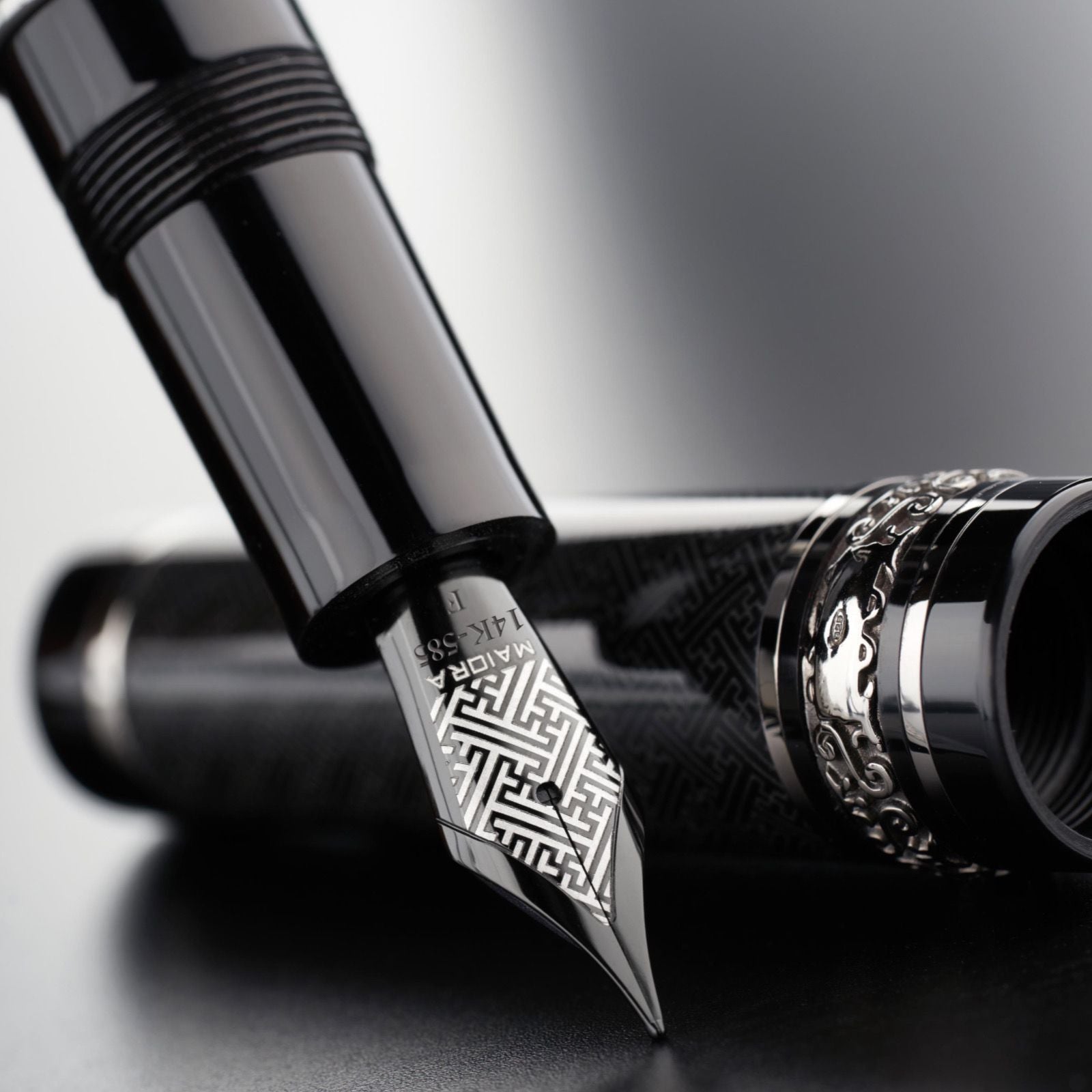 Made with special resin hand turned from solid bar in deep black colour. This limited edition has only 188 pens available worldwid, "Dedalo" presents an exclusive design, characterized by a unique pattern, repeated on both the body of the pen and the nib, offering an unprecedented visual experence. Band in 925 sterling silver, plated with precious ruthenium; precious ruthenium-plated metal parts; ink cartridge/converter/dropper filling mechanism; 14 carat gold nib, available in : extra fine, fine, medium, broad, stub 1.1, flex extra fine and fine. This pen celebrates the legend of Daedalus, the architect of the famous Minotaur labyrinth, with a design that reflects the complexity and artistry of his most enigmatic creation.