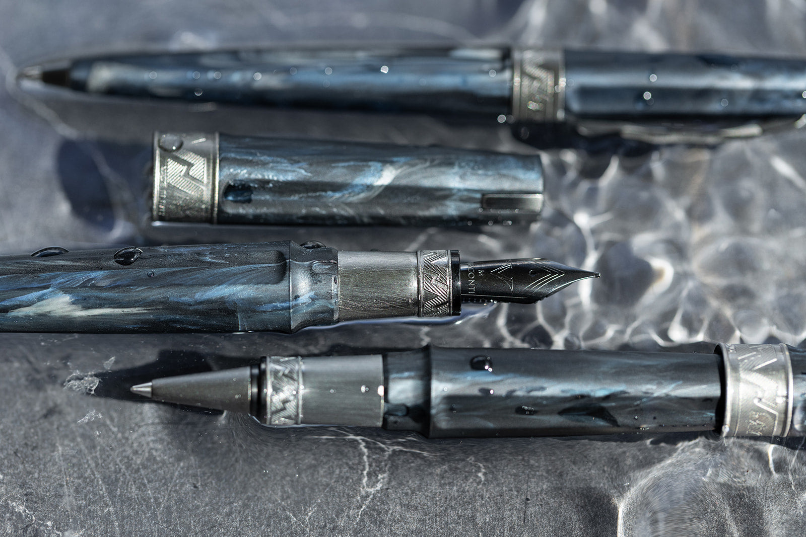 The Poseidon pen is a stunning example of Visconti's design philosophy. The dark sea blue resin captures the essence of the deep sea, where Poseidon was believed to dwell and rule over the waves and storms. In coordination with the dark color of the resin, for the first time in the collection, features a ruthenium nib and trims. Both the pen's body and trims are sandblasted to create an elegant contemporary feel to the design.