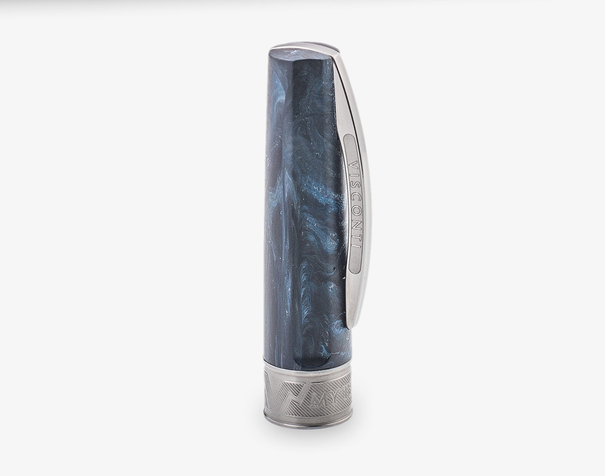 The cap elegantly closes with a magnetic twist closure, and is accented by brass with Ruthenium in a sandblasted finish trim. The center ring is engraved with the inscription, MYTHOS, and a V to emulate a stylized Mount Olympus.