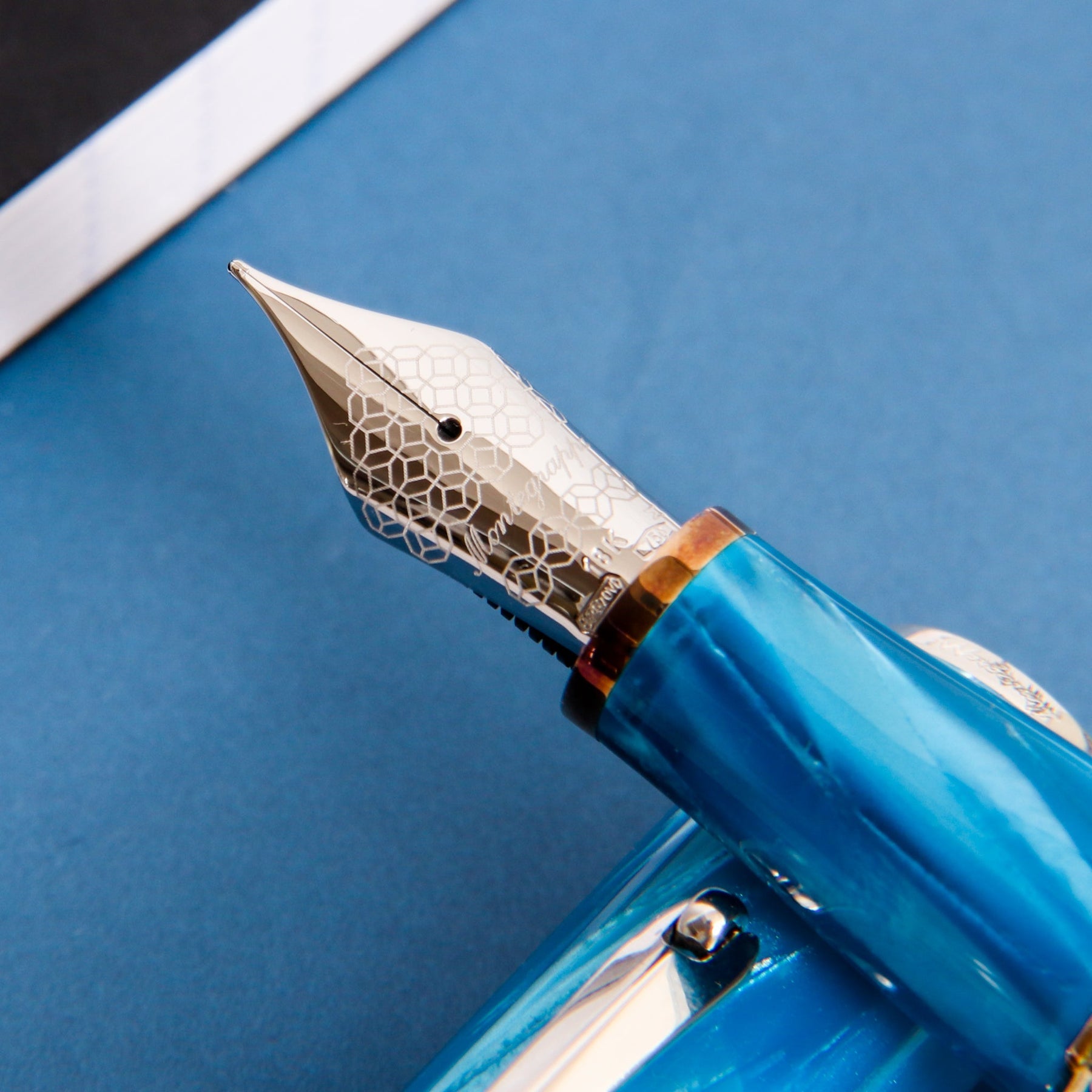 The Montegrappa Celluloid Masters Arte Turquoise is a pen of striking beauty. 18k solid gold rhodium-plated nibs are available in tipping sizes ranging from Extra Fine to Broad.