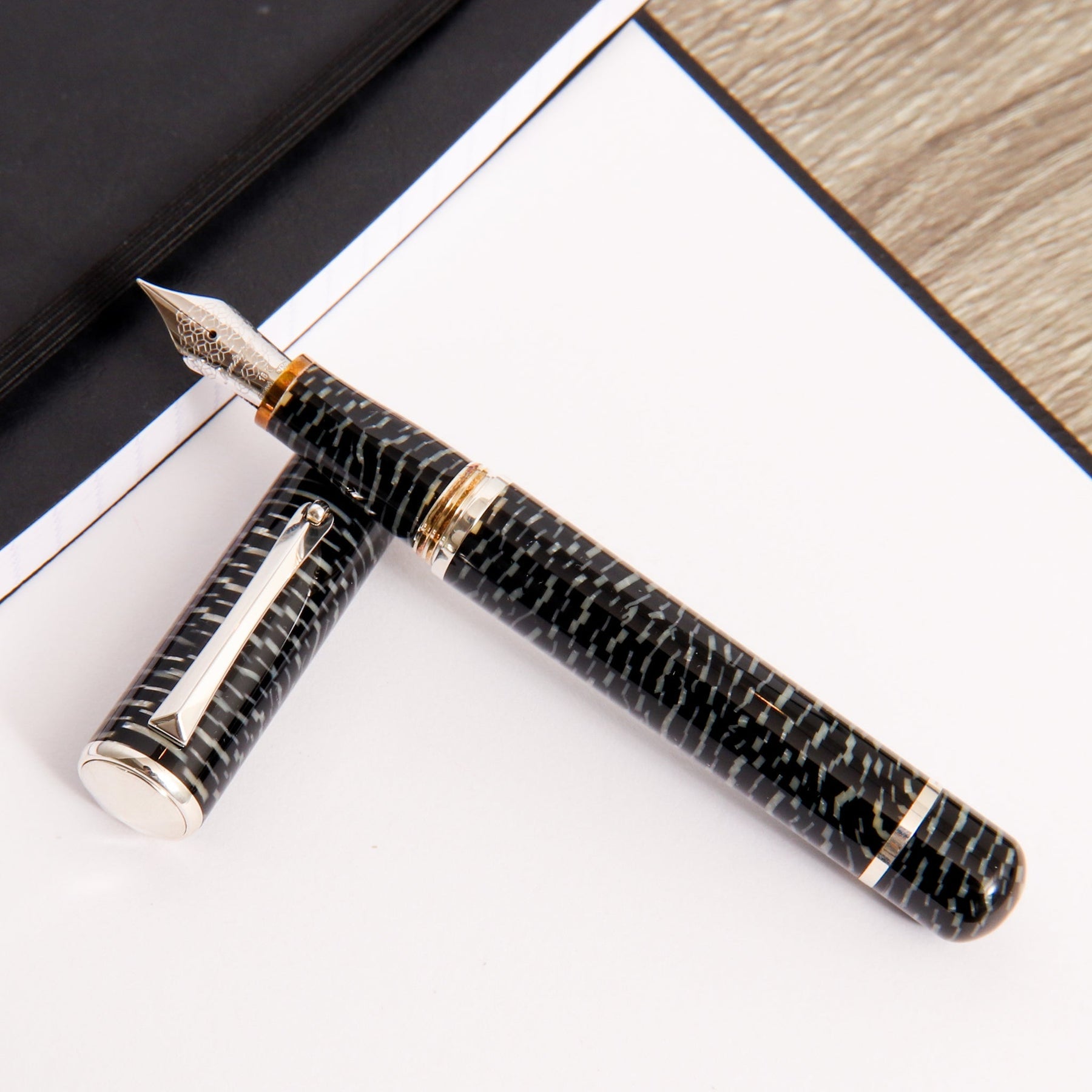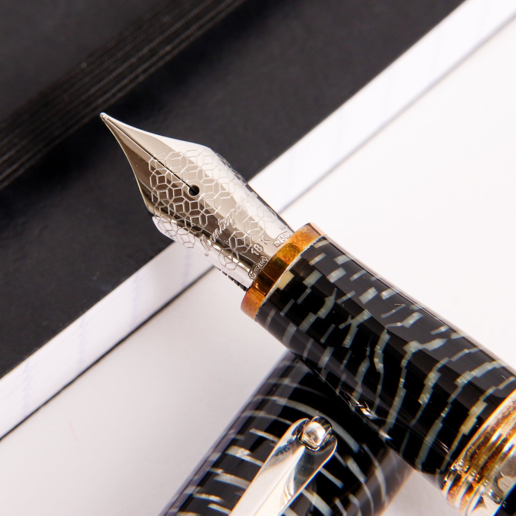 The Montegrappa Celluloid Masters Arte Zebra combines subtlety and style to create a writing instrument of striking beauty. 18k solid gold rhodium-plated nibs are available in tipping sizes ranging from Extra Fine to Broad.