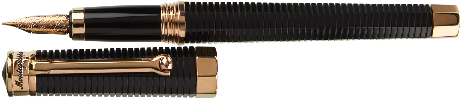 With its faceted body and understated pattern of engraved lines, the Montegrappa NeroUno Linea Glossy Black with Rose Gold Trim fountain pen is a tactile experience in the hand. The combination of shiny black resin with warm rose gold metal is a unique twist on a classic.