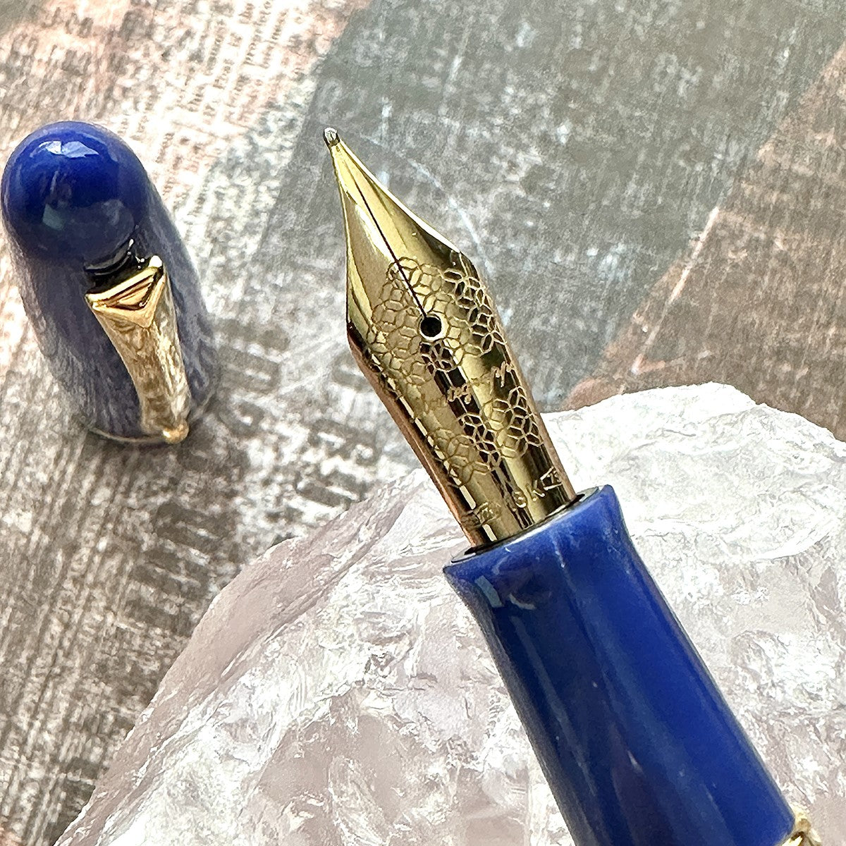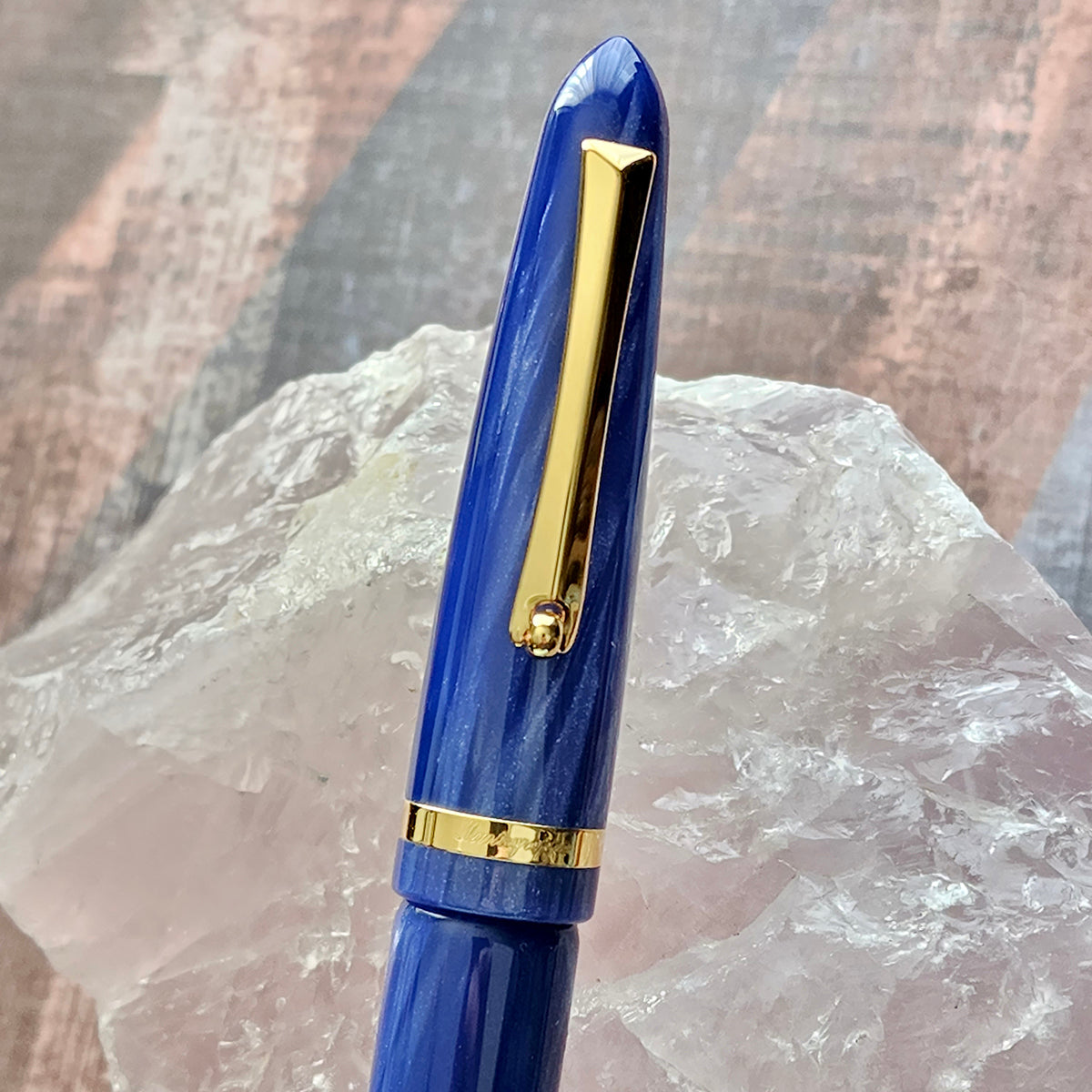 The Montegrappa Venetia Glittering Blue Celluloid is a smartly realized combination of the classic and the contemporary. This stylish fountain pen is provided with your choice of 18k solid gold nib in tipping sizes ranging from Extra Fine to Broad.