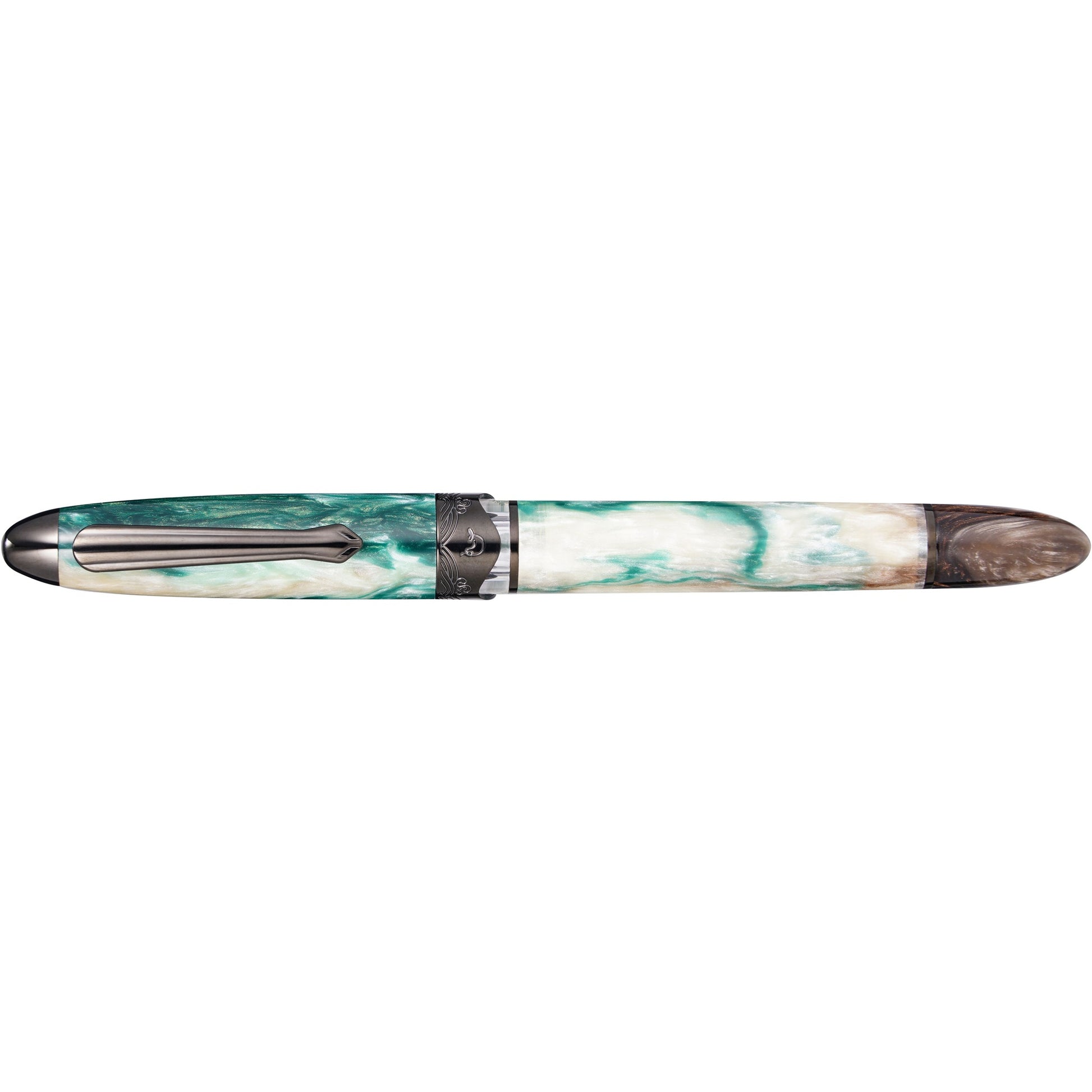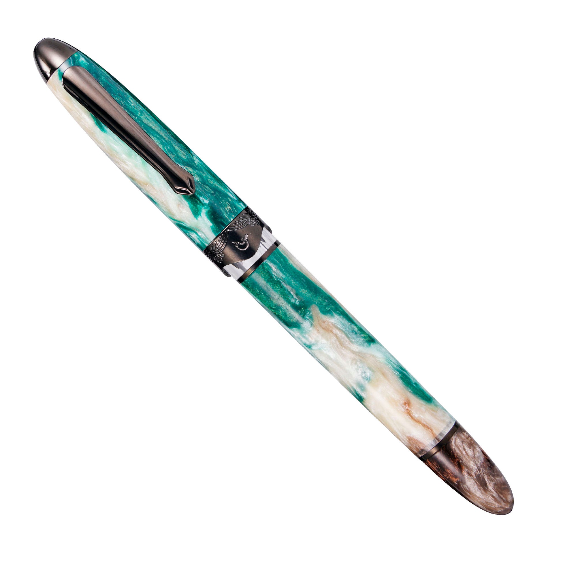 The Nahvalur Horizon takes its inspiration from the view of the horizon at different times of the day and under differing weather conditions. Swirling colors accentuate the classic cigar profile of this pen, while the curving metal ring emulates undulating ocean waves.