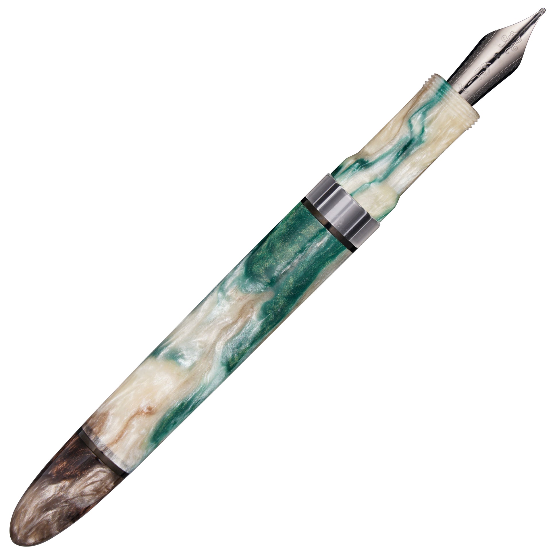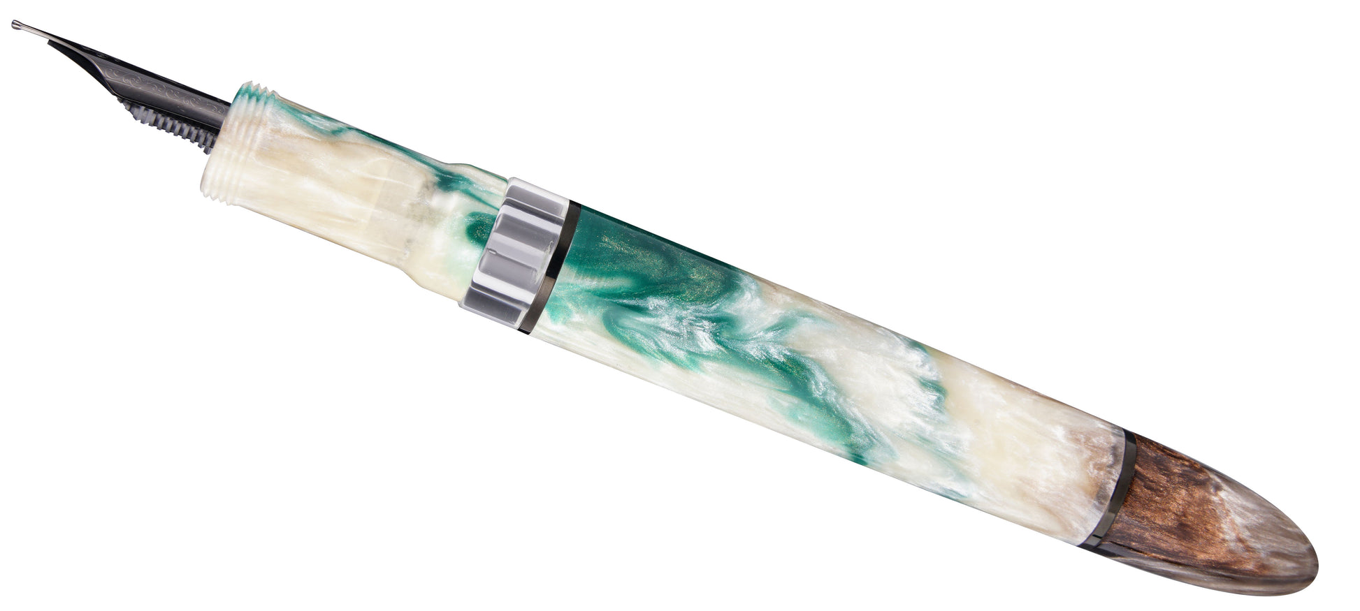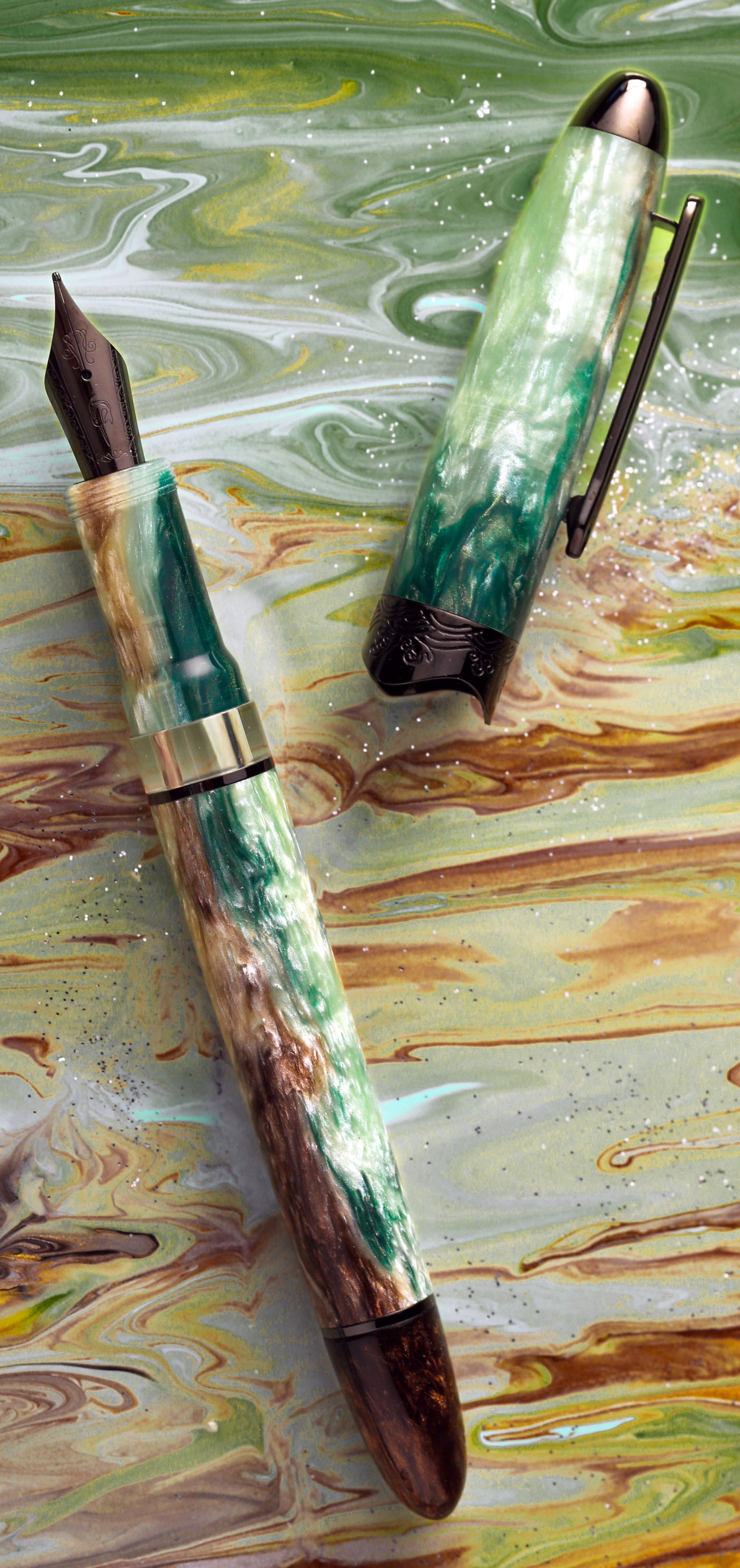 Evocative swirling browns, greens, and white are accented by ruthenium trim in the new Nahvalur Horizon Twilight. Normally provided with only a steel nib, we are offering this pen exclusively with a 14k solid gold nib in Medium. Regrinds to finer tipping sizes are also available from us.