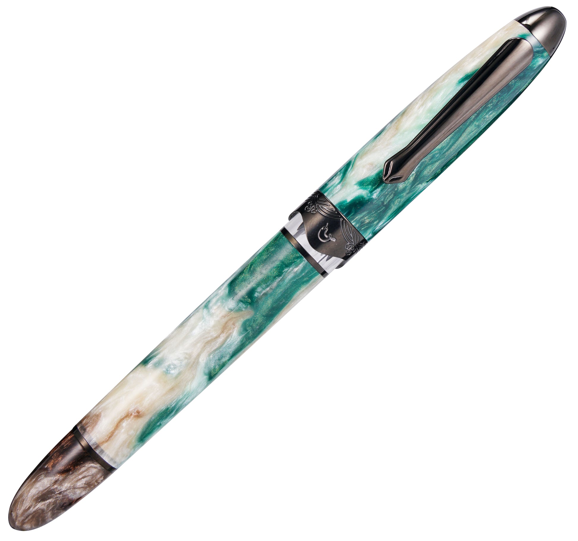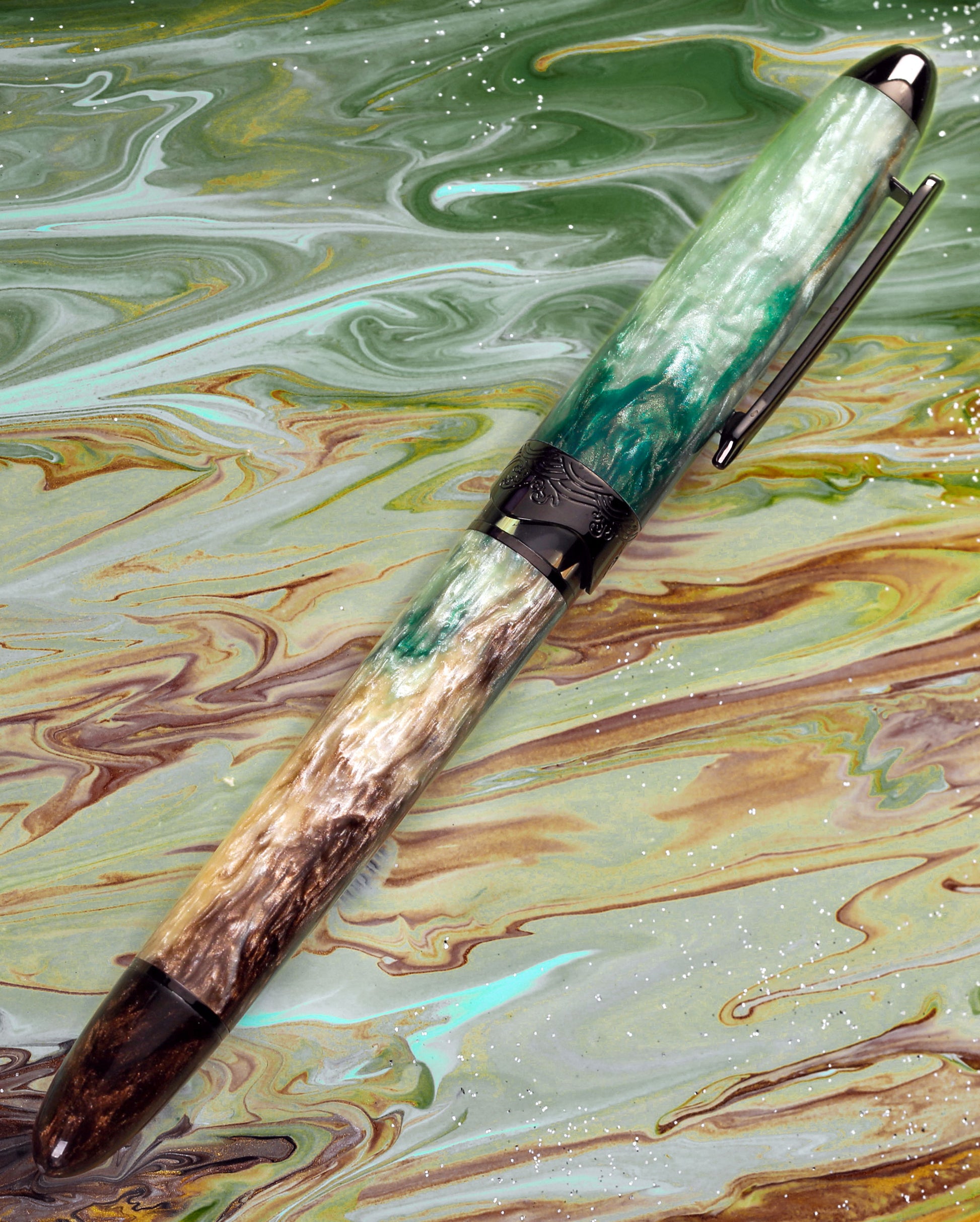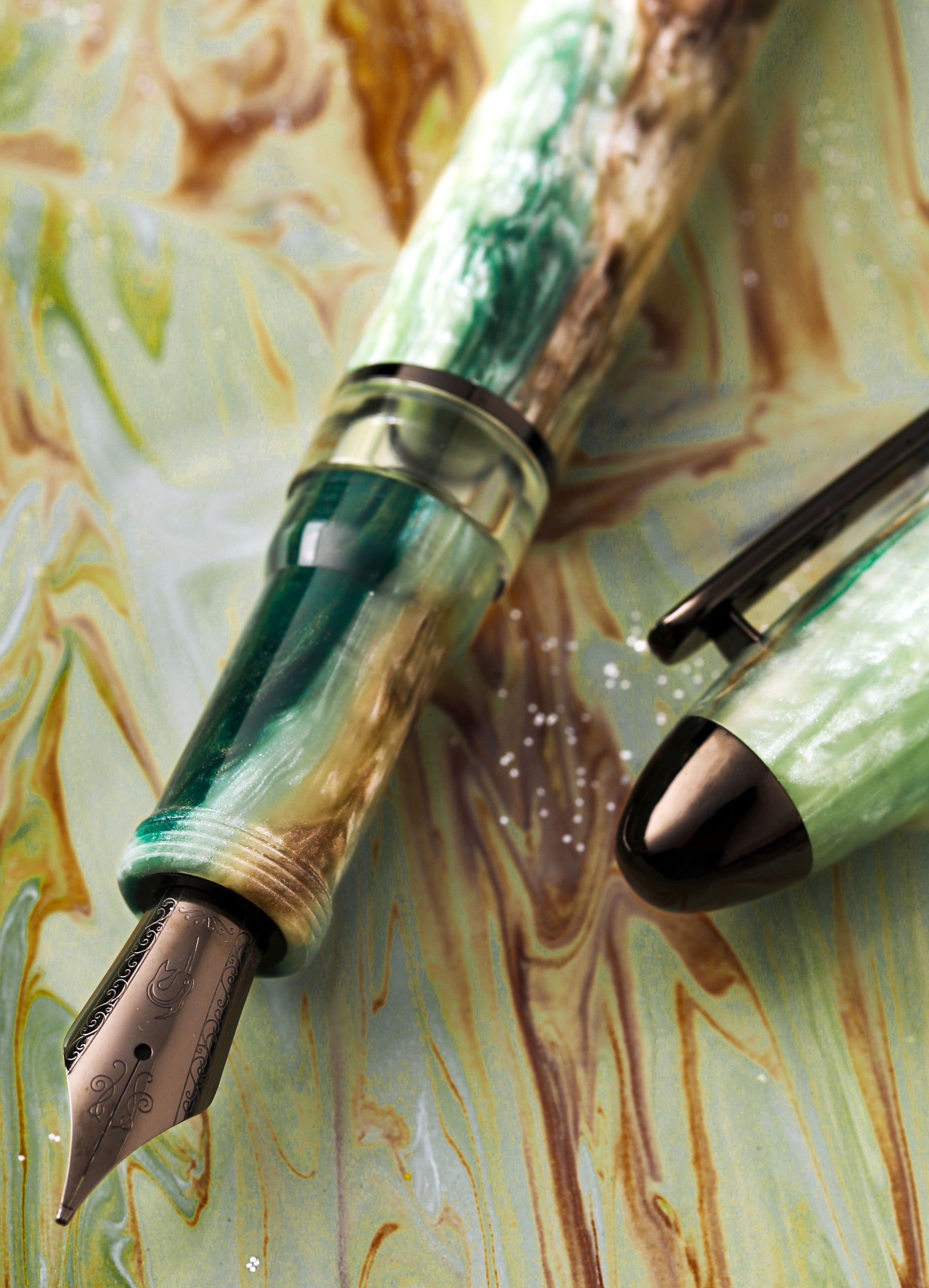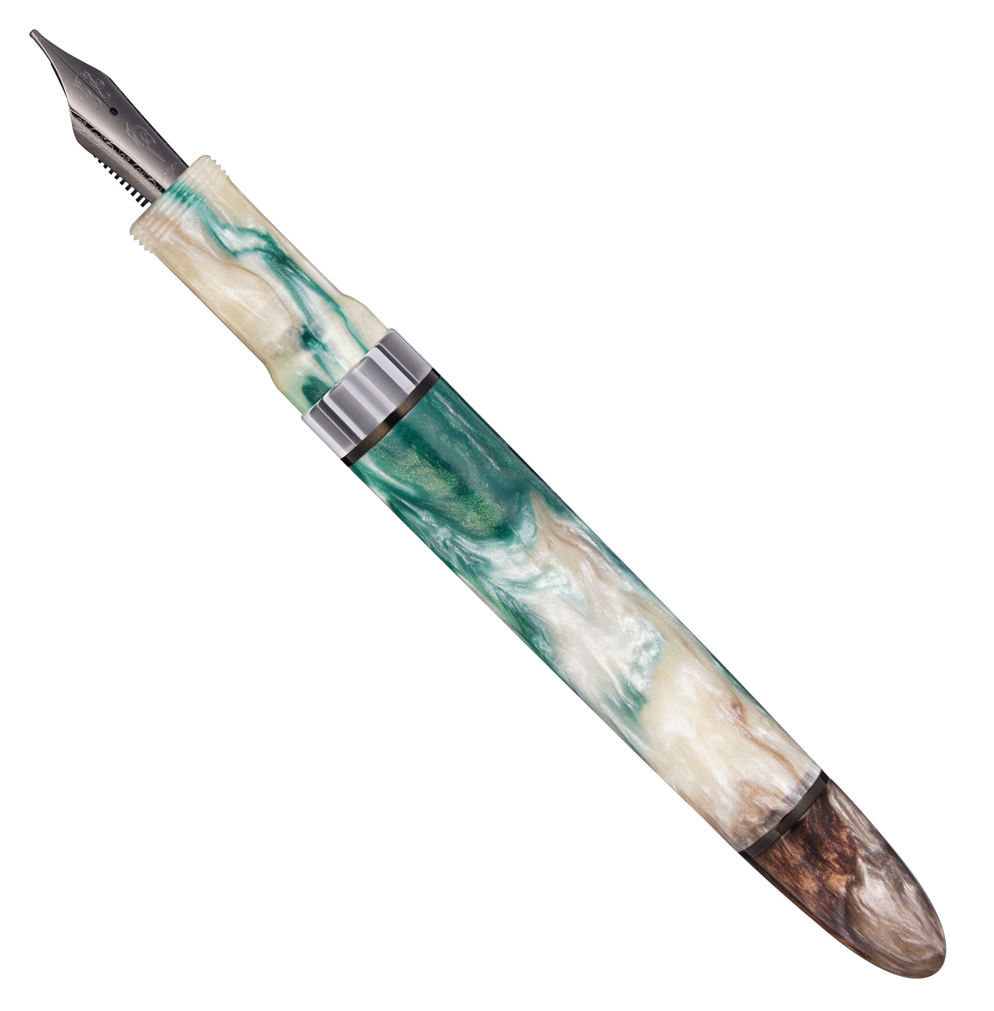 Evocative swirling browns, greens, and white are accented by ruthenium trim in the new Nahvalur Horizon Twilight. Normally provided with only a steel nib, we are offering this pen exclusively with a 14k solid gold nib in Medium. Regrinds to finer tipping sizes are also available from us.