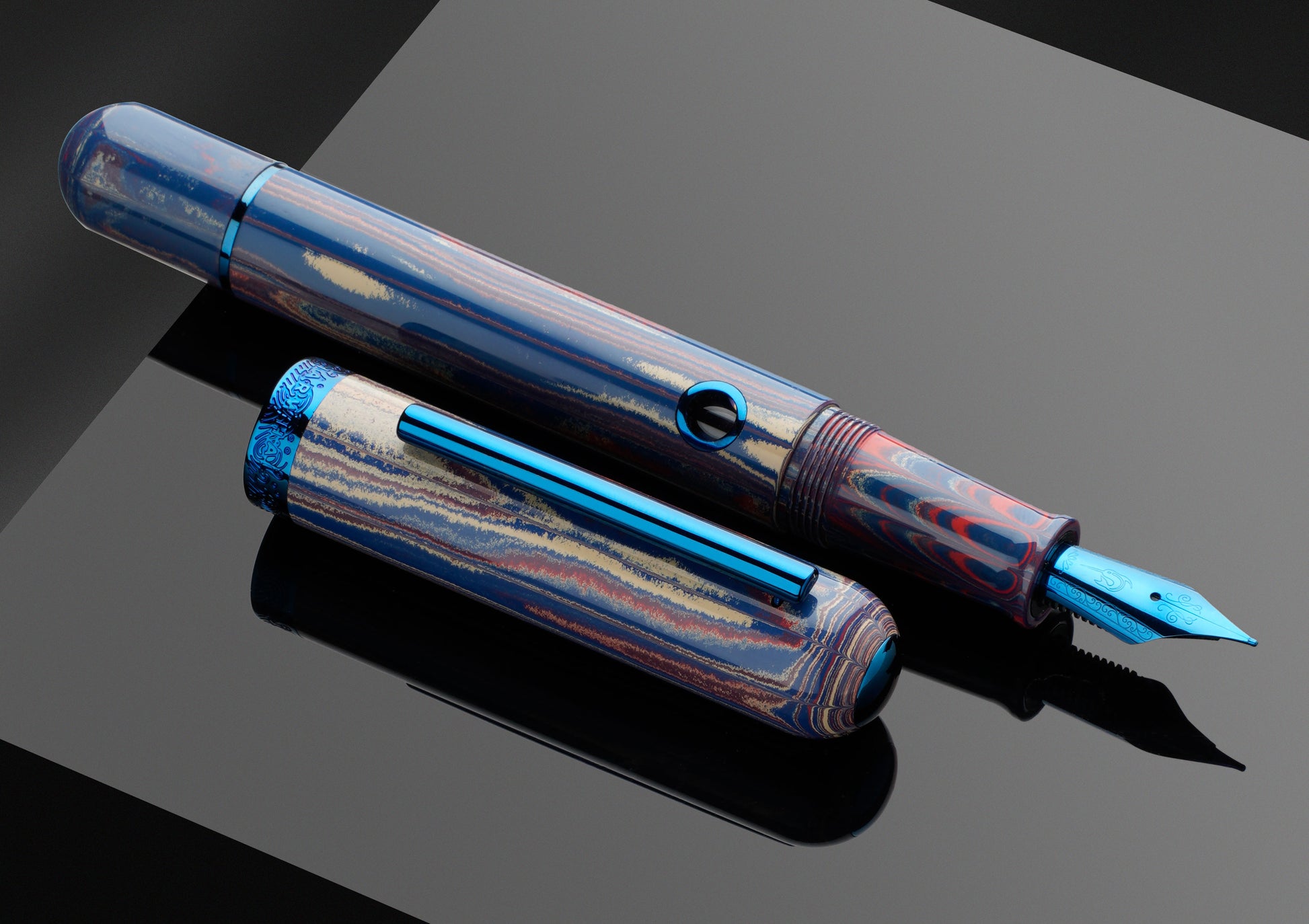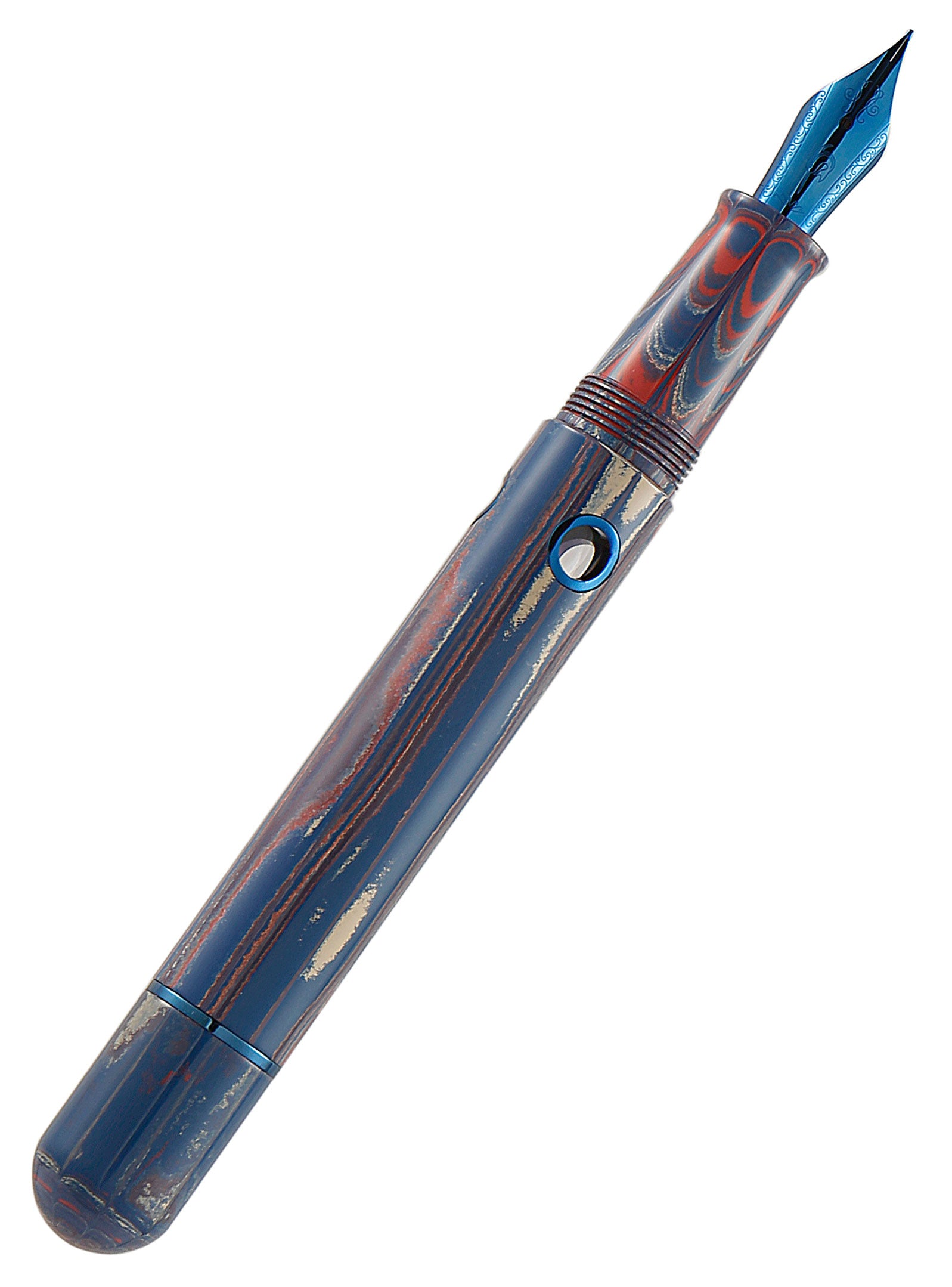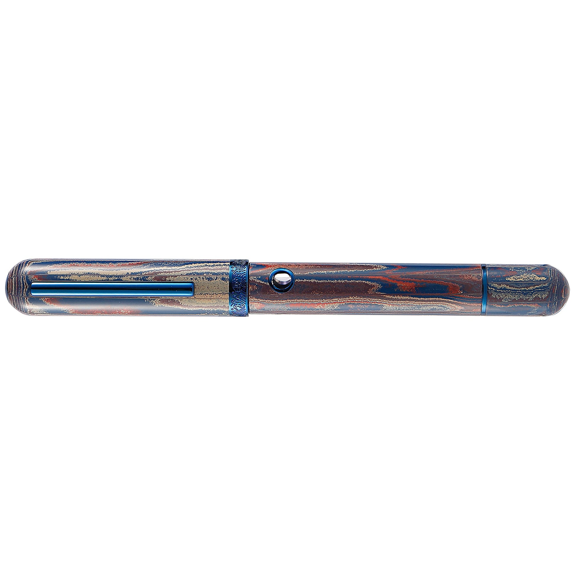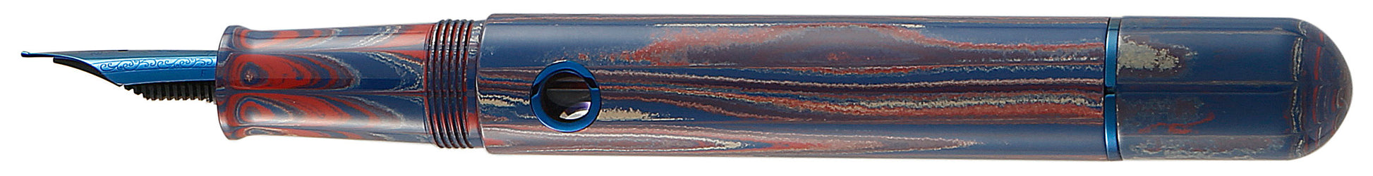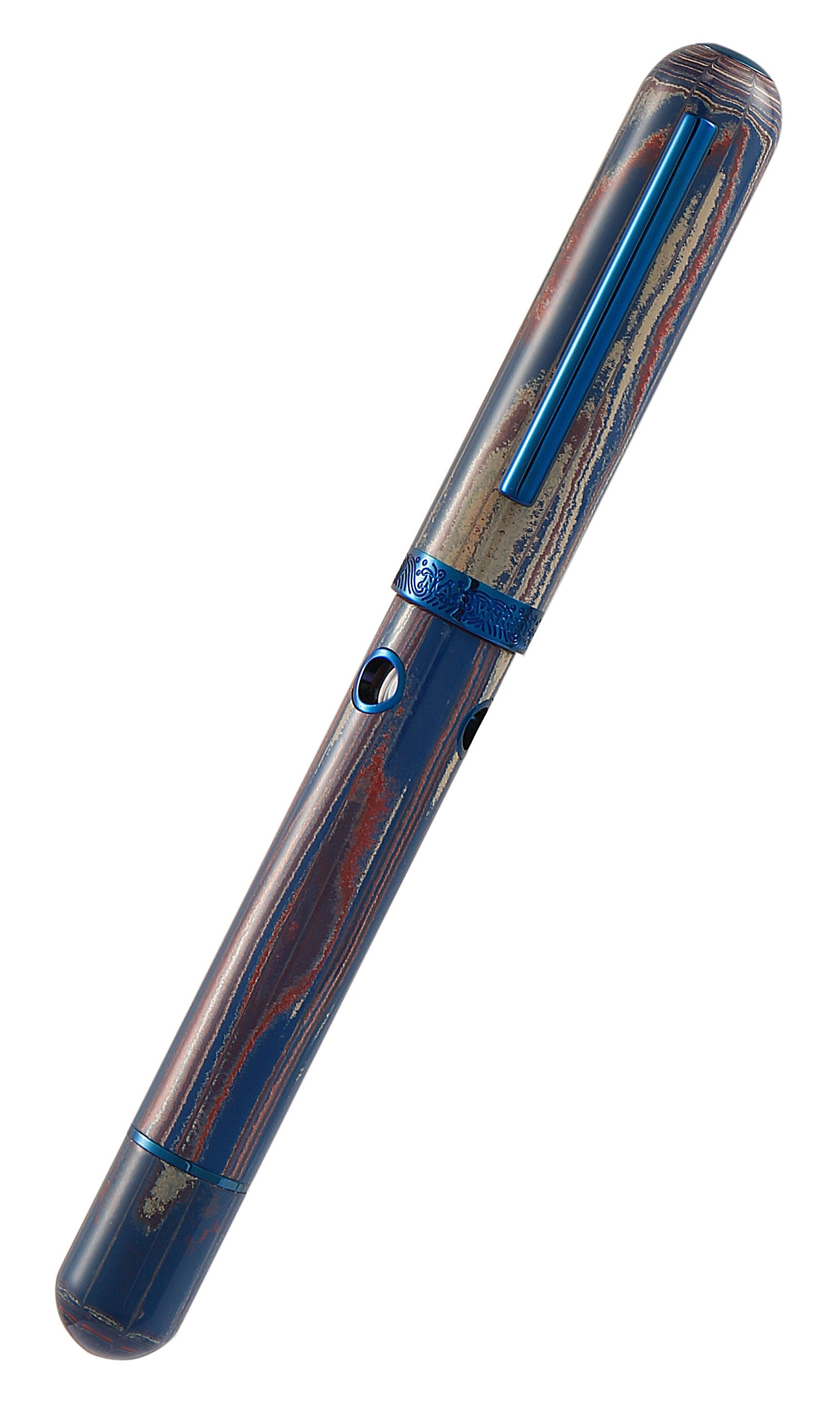 The iridescent colors of handcrafted German ebonite give the new Nahvalur Nautilus Blue Ringed 14k Limited Edition a captivating and unforgettable appearance. Normally provided with only steel nibs, we are offering this pen exclusively with a 14k solid gold nib that has been specially treated to match the colors of the pen body and trim.