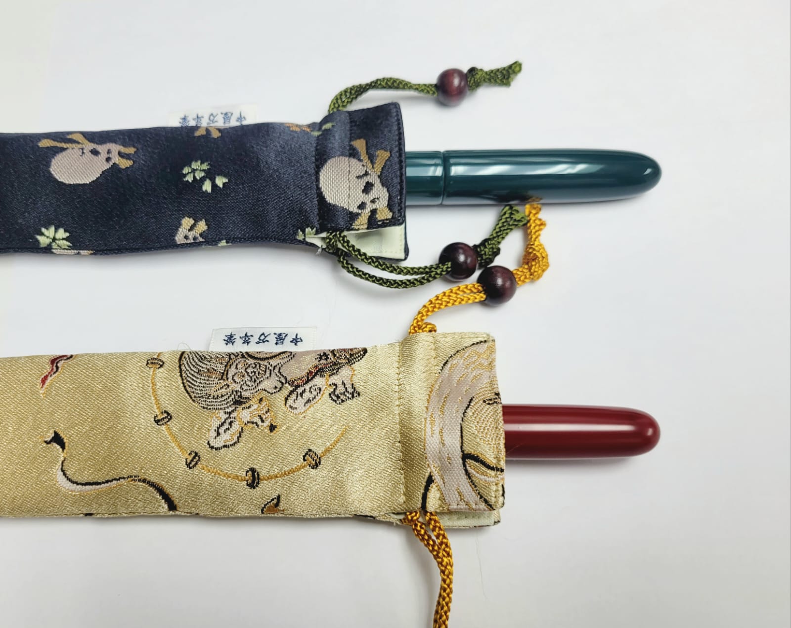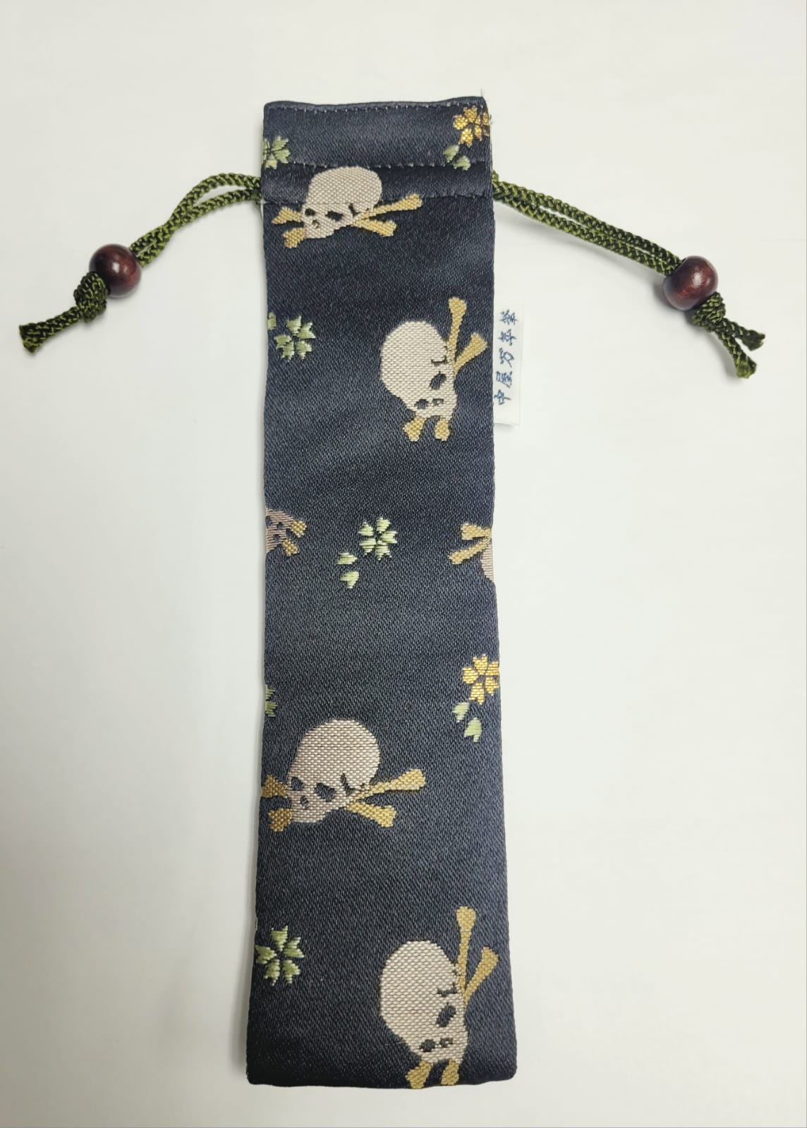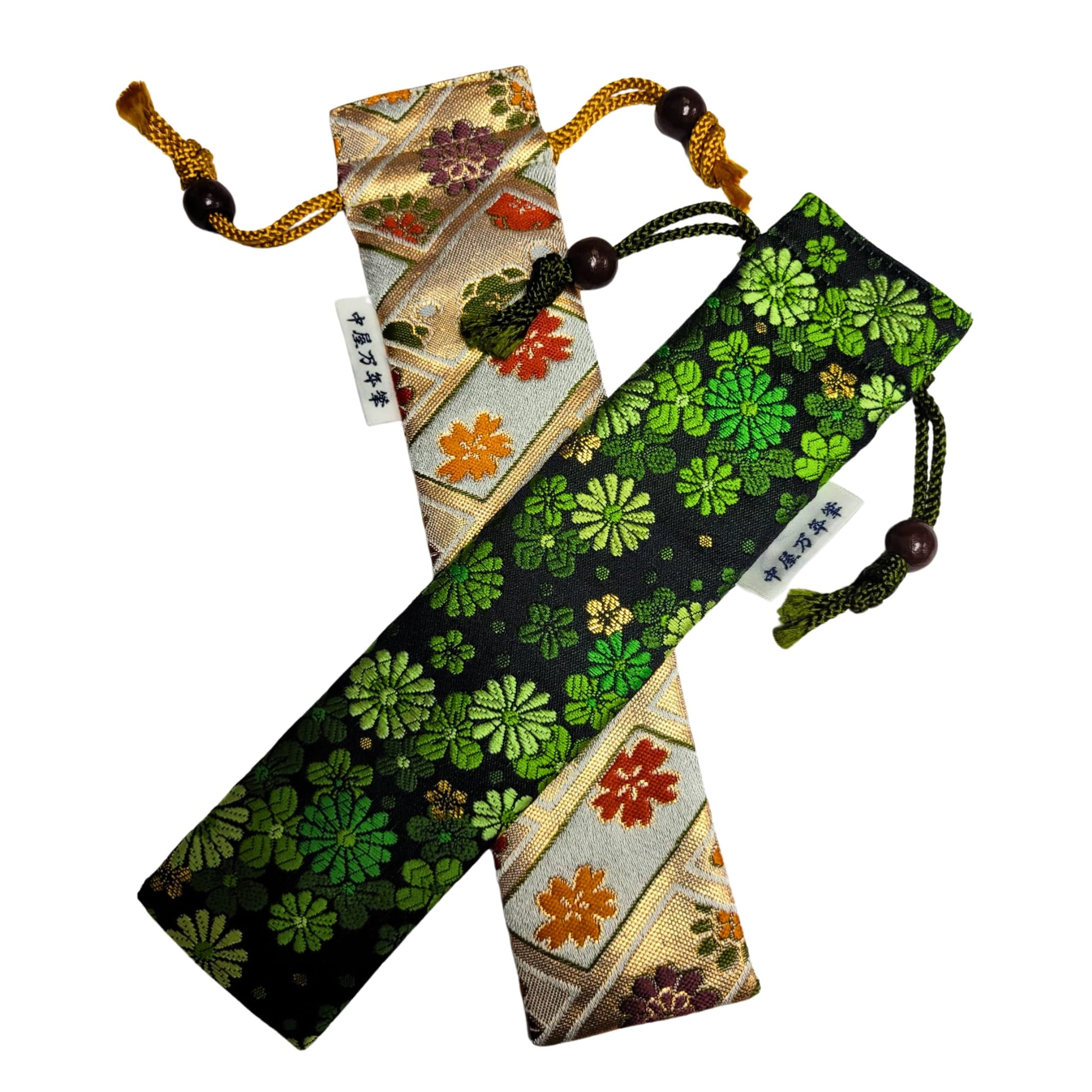 Discover the Nakaya Kyoto Nishijin-ori Pen Pouches, each designed to hold a single pen and adorned with striking patterns like the intricate Fujin Raijin (wind god and thunder god), bold Skull design, vivid Green and Gold Meadow, or the elegant Floral Tapestry. These luxurious pouches are crafted from Nishijin textile, a prestigious Japanese cloth woven with threads dyed before weaving in a process known as saki-some.