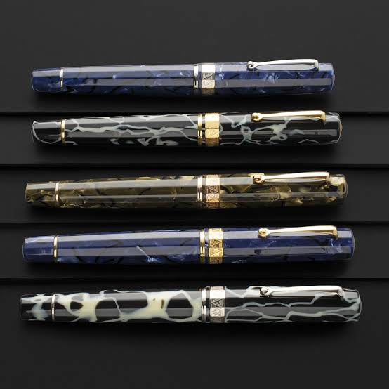 The new OMAS Paragon Blue Royale Gold utilizes one of the most beloved celluloid patterns created by this legendary Italian manufacturer. 14k nibs are available in Fine and Medium, and regrinds to finer tipping sizes are also available from us.
