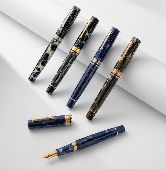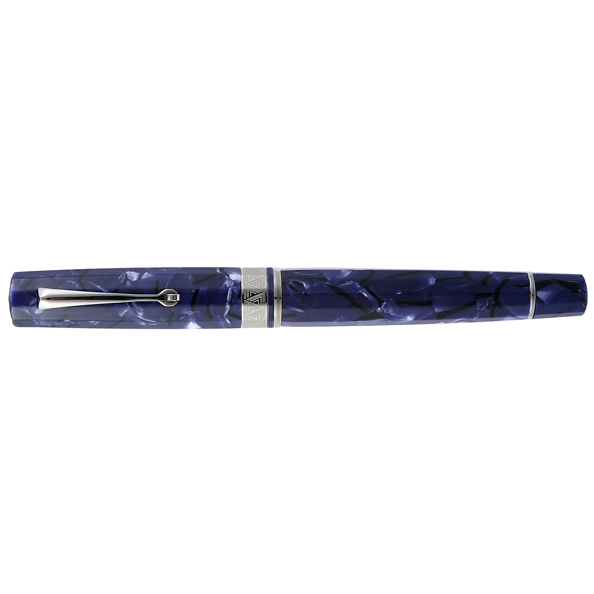 Rich blue legacy celluloid and gleaming rhodium trim combine to give the new OMAS Paragon Blue Royale Silver its memorable and unmistakable appearance.14k nibs are available in Fine and Medium, and regrinds to finer tipping sizes are also available from us.