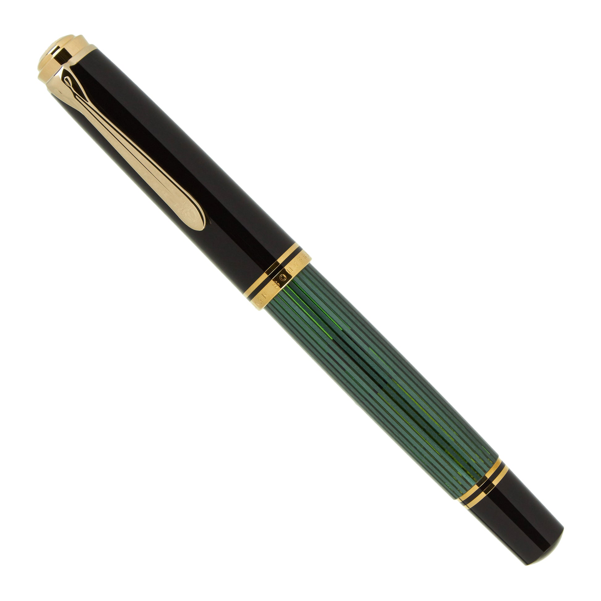 The Pelikan M800 Green Stripe with Gold Trim is recognized as most iconic color combination associated with the Pelikan line of fountain pens. With its green striped semi-translucent body and warm gold on the clip and ring bands, this fountain pen will seem to many the quintessential Pelikan pen.