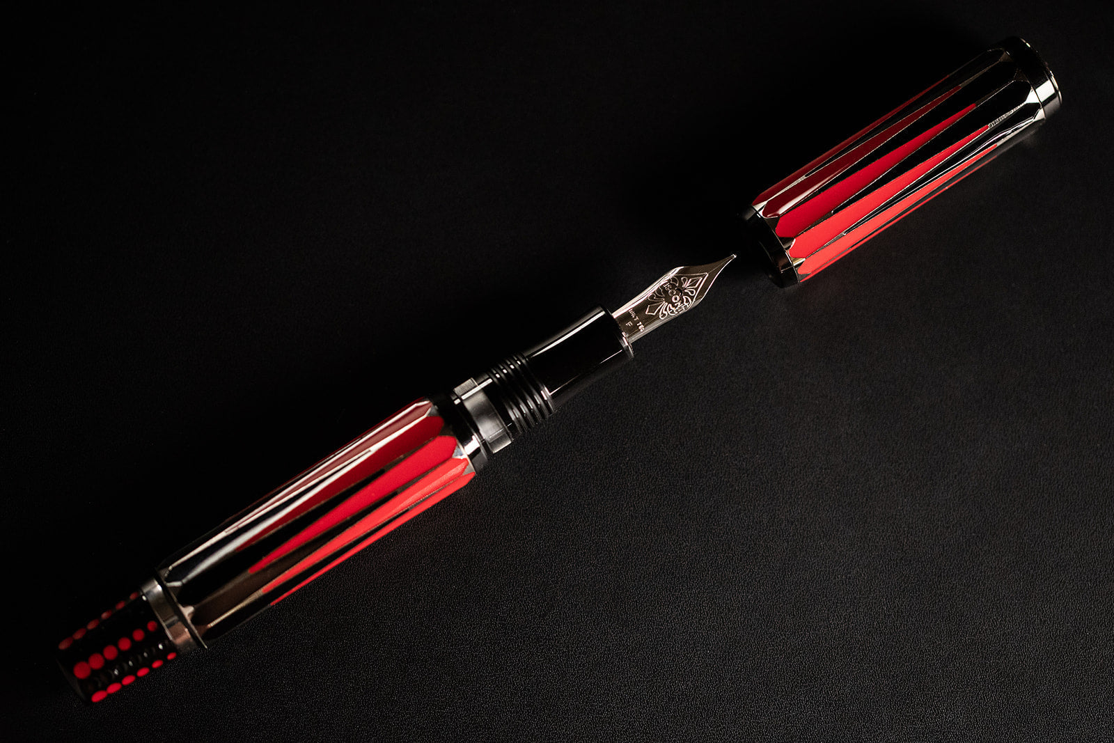 The pen, made entirely of 925 sterling silver, features the body in the over size. The contrast between the red and black triangles is highlighted by the enameling, which enhances the luster of the colors. The filling system is our Power Filler double reservoir, and the closure is screw-lock.