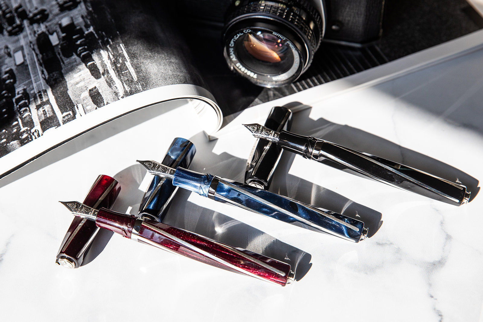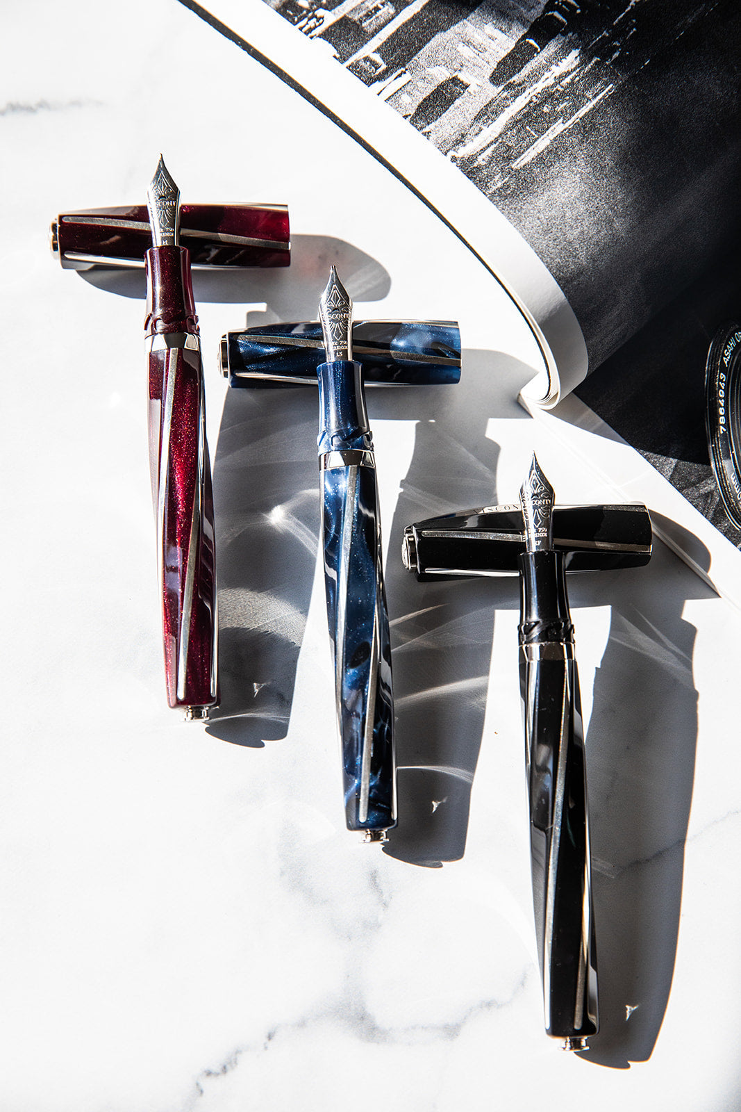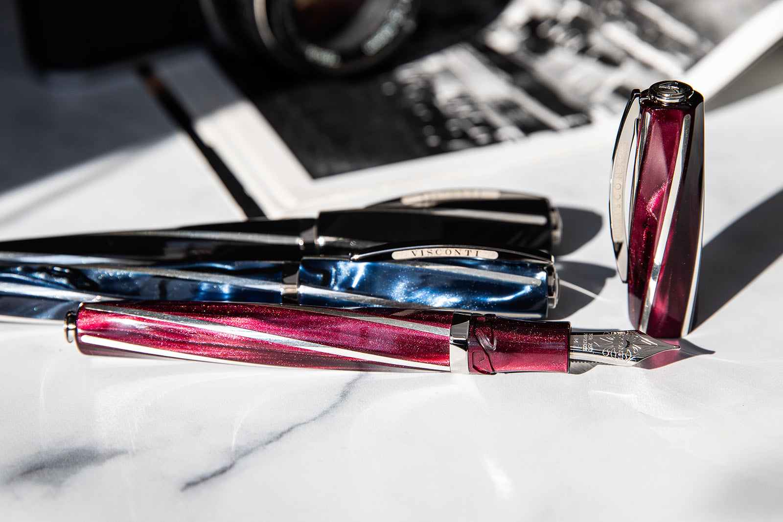 Available in oversize fountain pen, oversize rollerball and ballpoint. The fountain pen fills with the Visconti pull and turn piston mechanism and is completed with an 18kt gold nib, available in EF, F, M B, and Stub widths.
