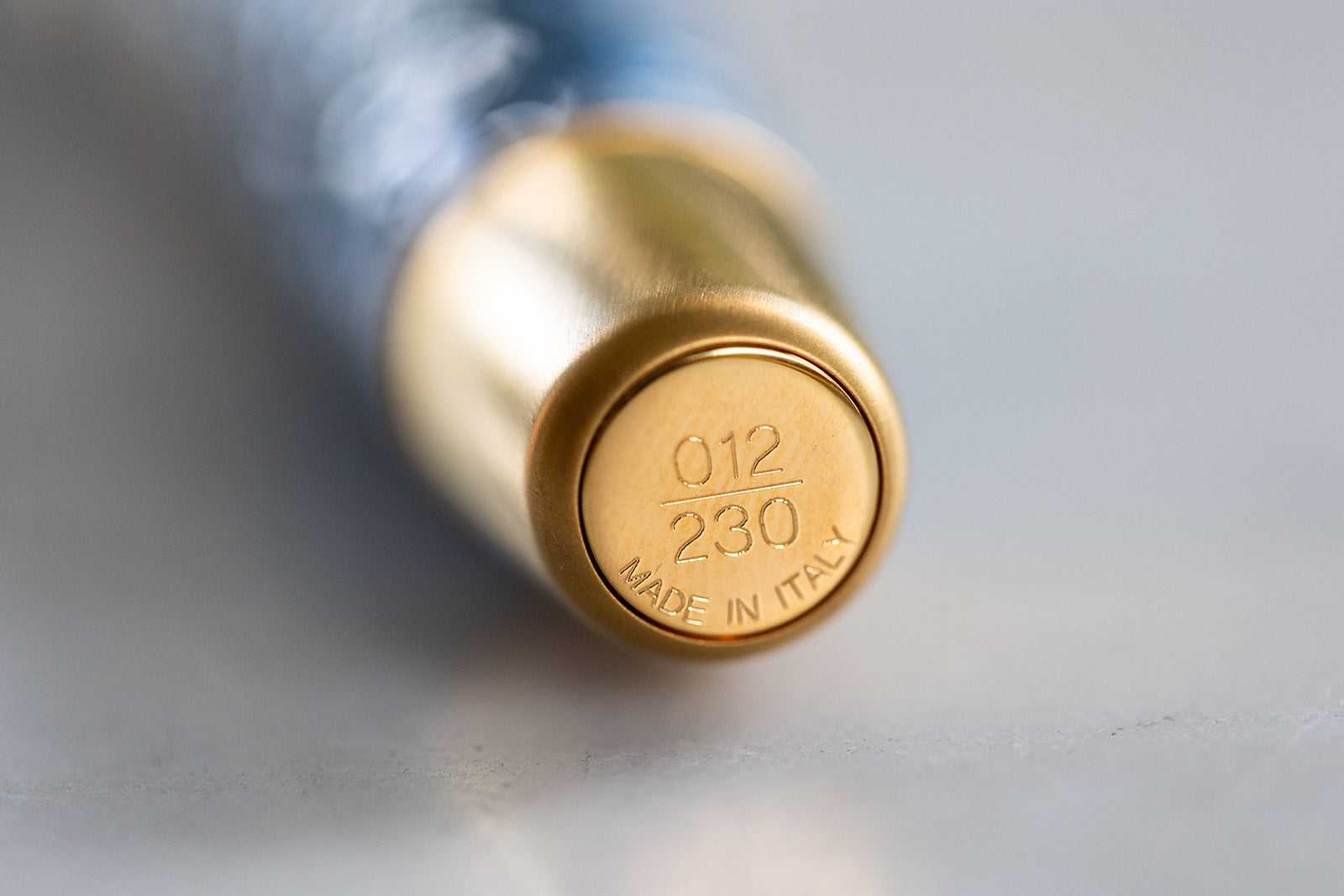 Even the smallest details of the Dreaming Starry Night are designed to celebrate art. In fact, the clip is a micro-cast in yellow gold-plated silver, representing a paintbrush, the painter's primary tool. The band features the artist's signature, engraved and highlighted with a blue enamel layer that elegantly contrasts with the yellow gold-plated metalwork of the pen.