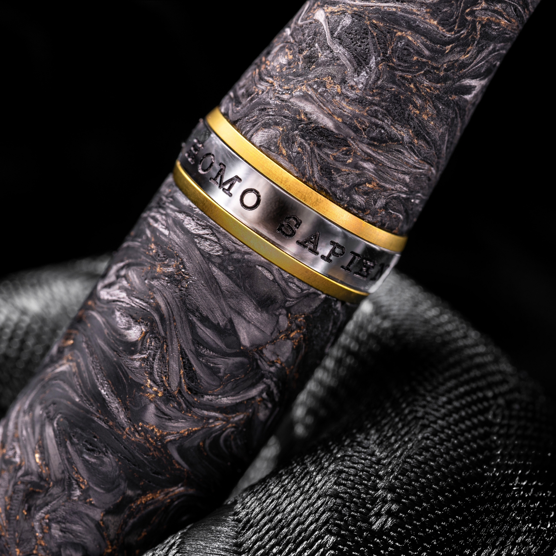 The fountain pen version of the Homo Sapiens Carbon Moiré is equipped with our iconic Power Filler Double Reservoir system. The central ring features a section in clear acrylic resin, allowing the ink level to be seen even when the pen is closed.