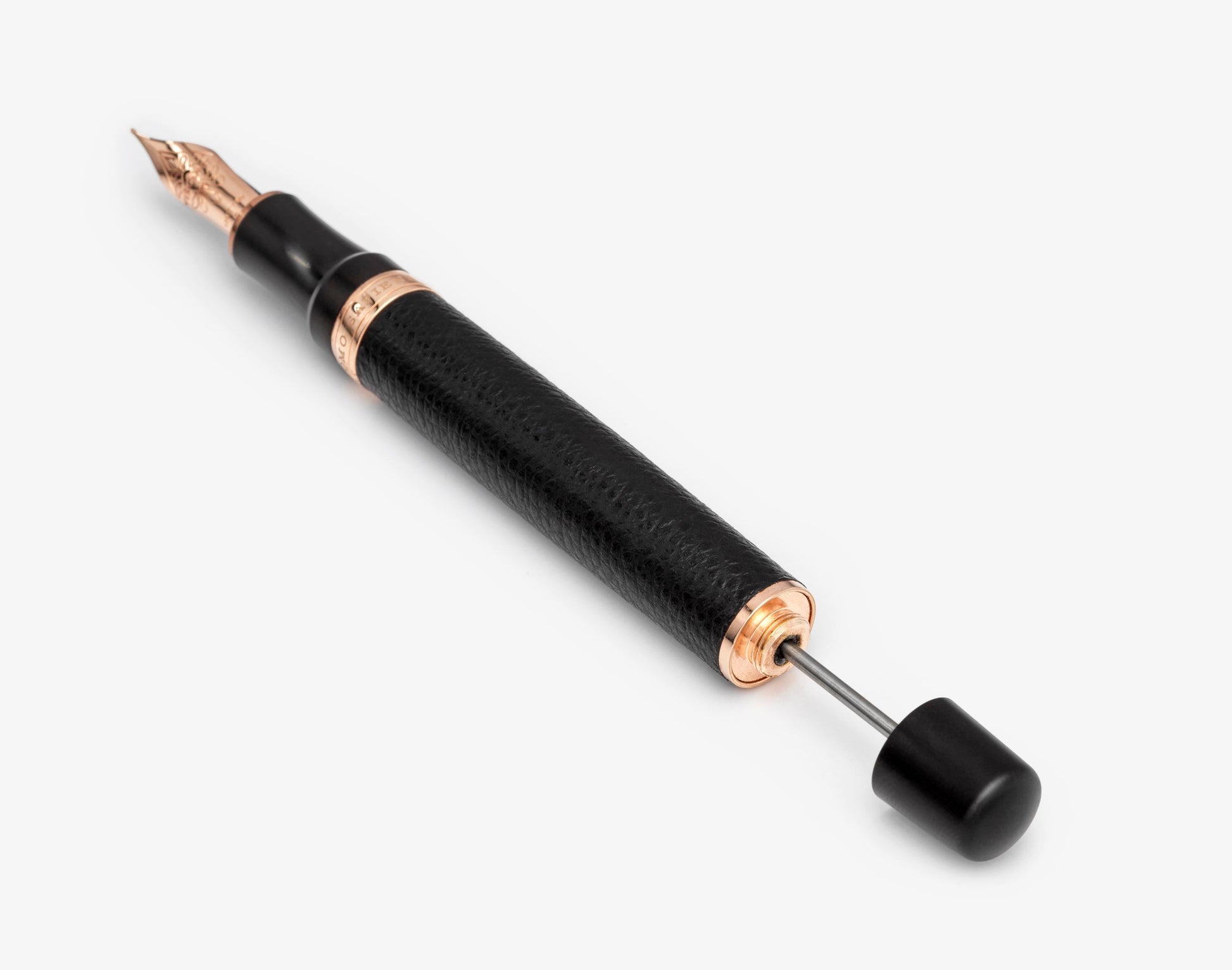 The pens are made of brushed metal, combined with palmetto textured leather, the result of a passion for experimentation and skillful use of materials. The leather barrel is embellished with a double stitching on the back and is coated with a protective treatment