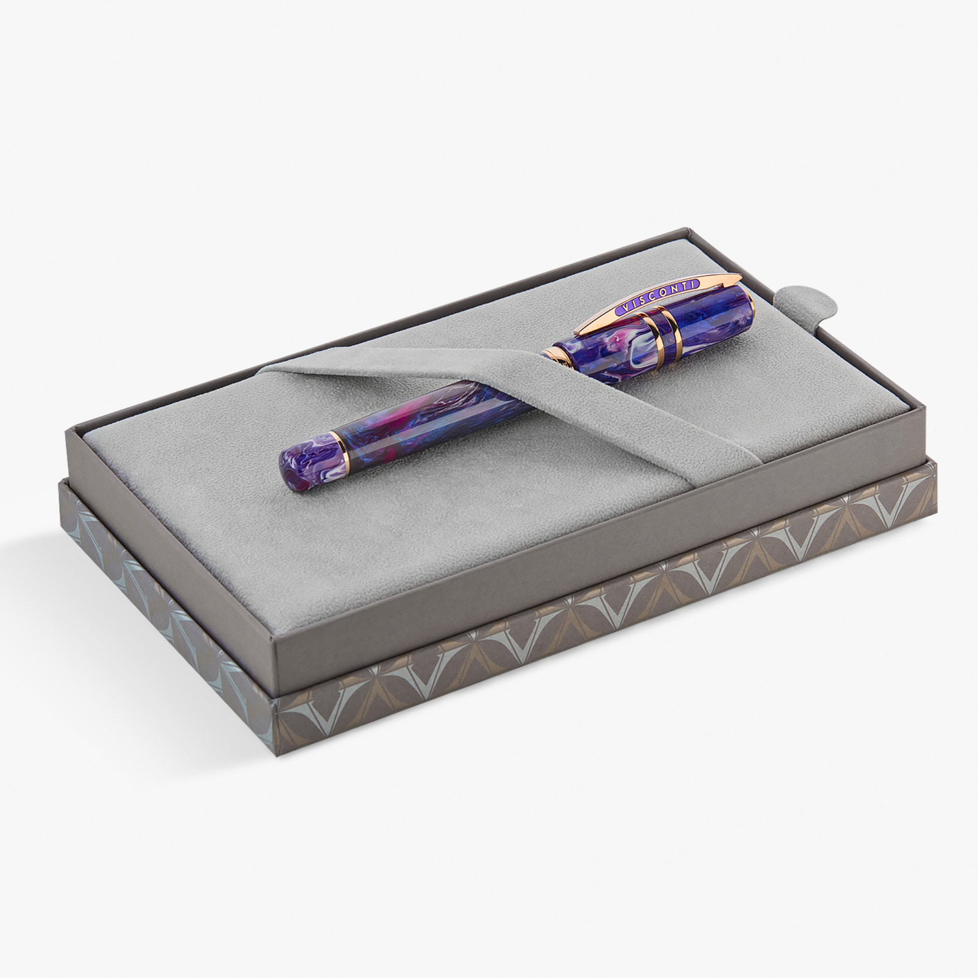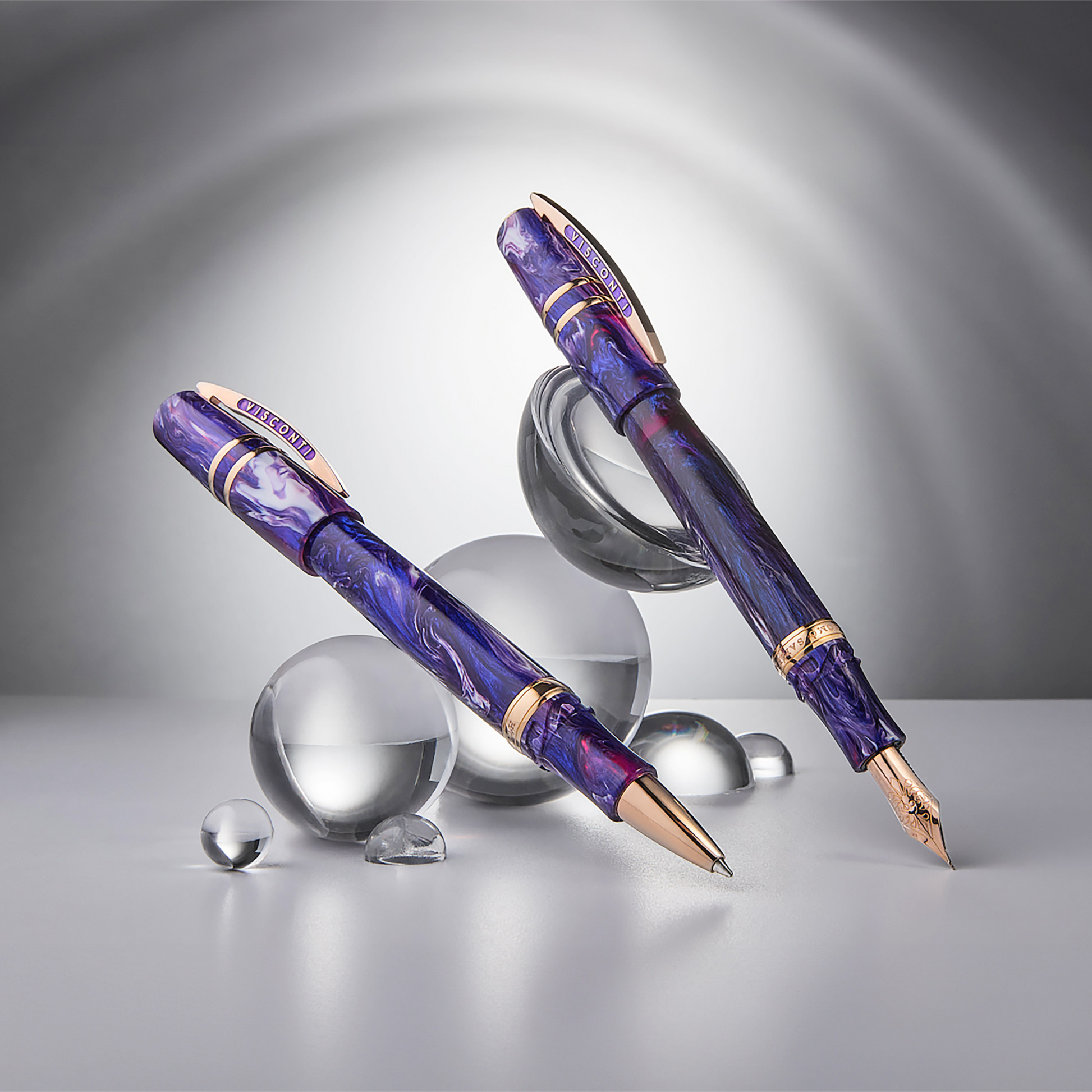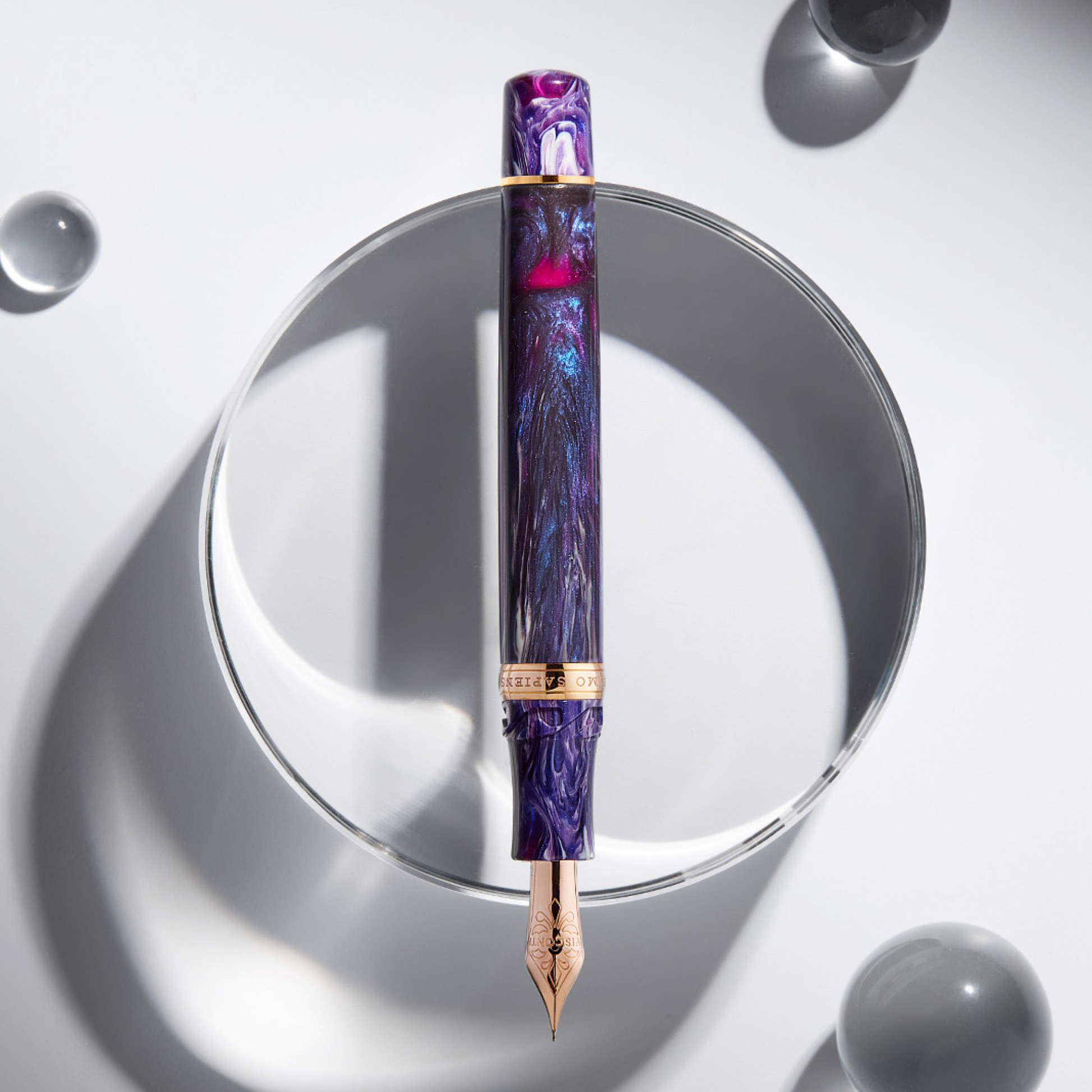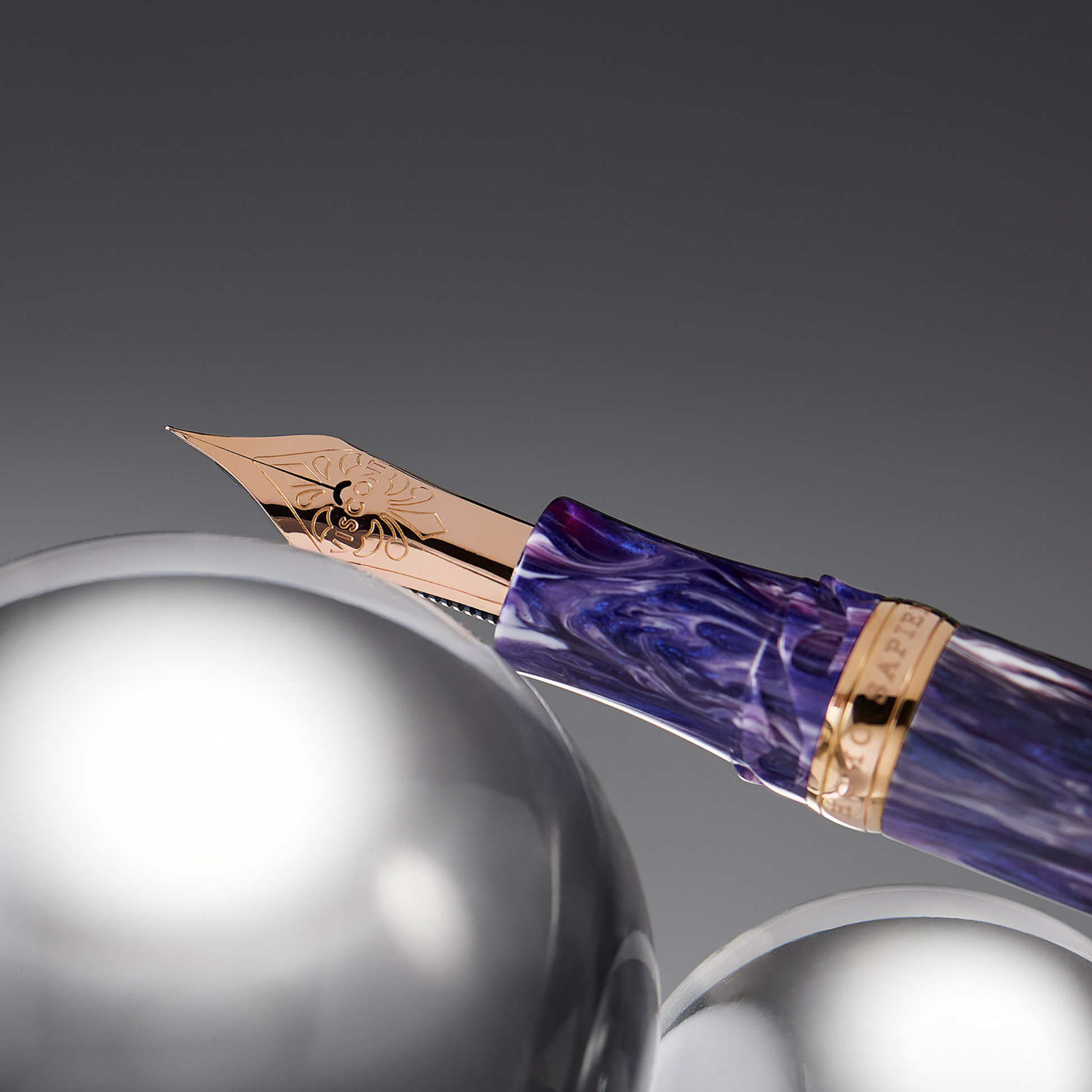 To honor the mystique of this legendary element, the Homo Sapiens Earth Origins Aether pen is crafted from mesmerizing bluish-purple resin, a shade long associated with nobility, wisdom, and the infinite sky. The celestial hue, shifting between deep violet and radiant indigo, captures the essence of the cosmic unknown.