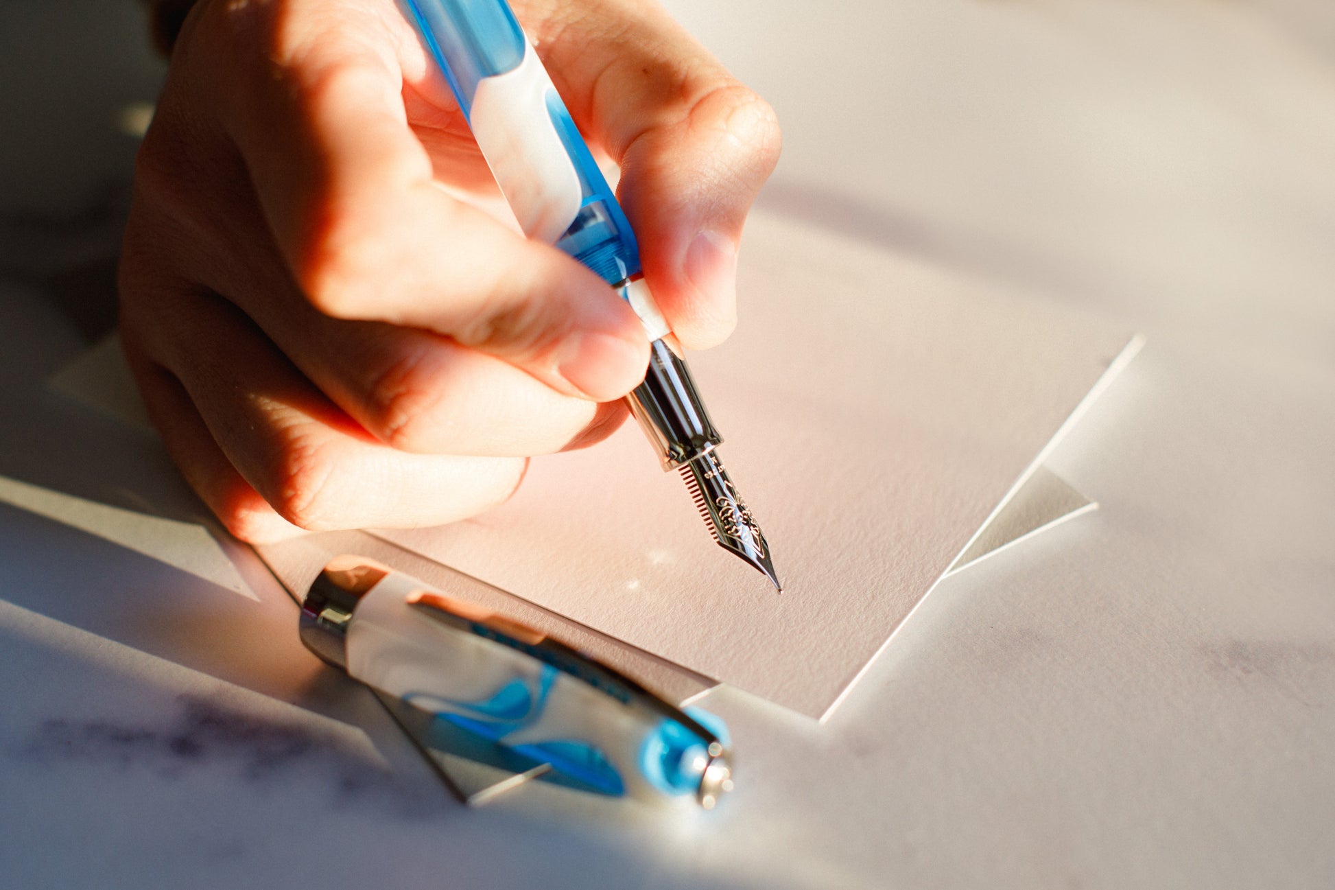 The Opera Master Antarctica fountain pen is a demonstrator model. The transparency of the pen makes the ink in the reservoir visible, reproducing the effect of an ocean covered by sheets of ice.
