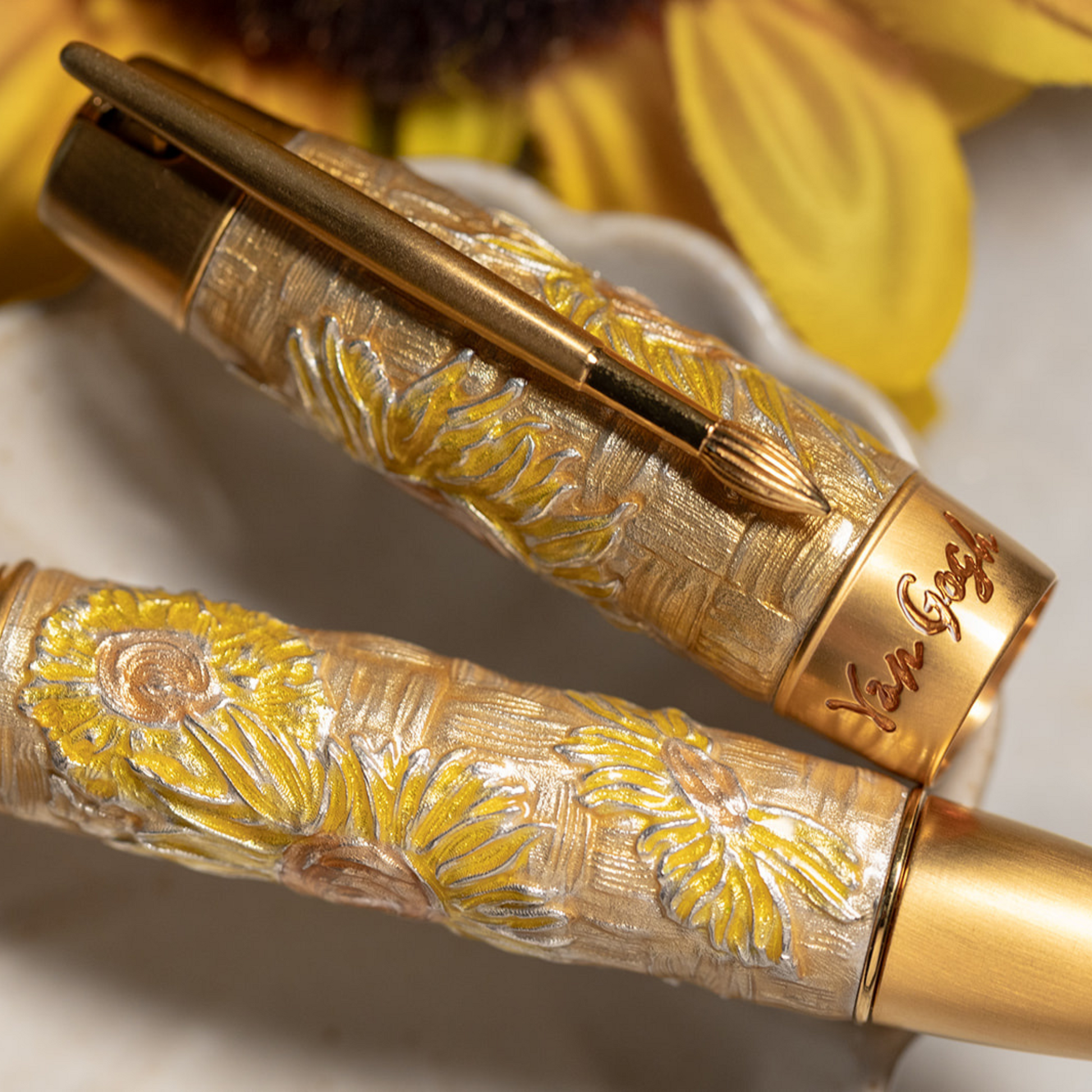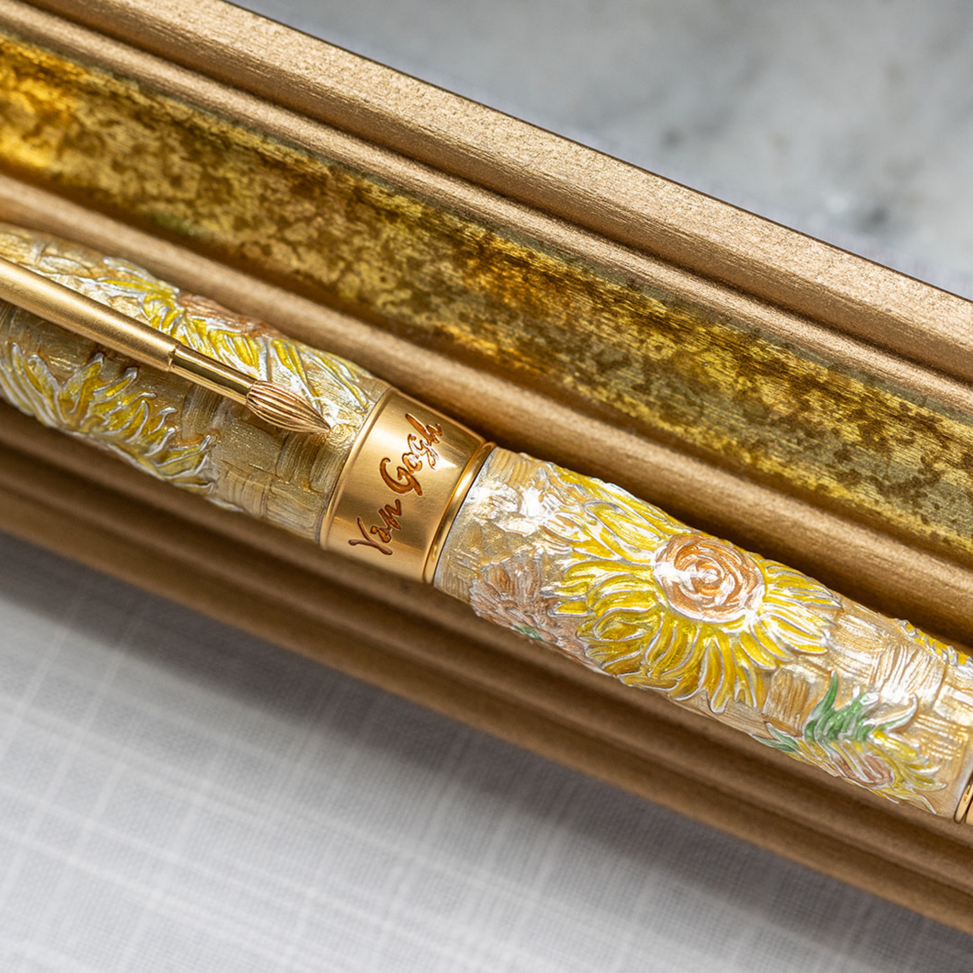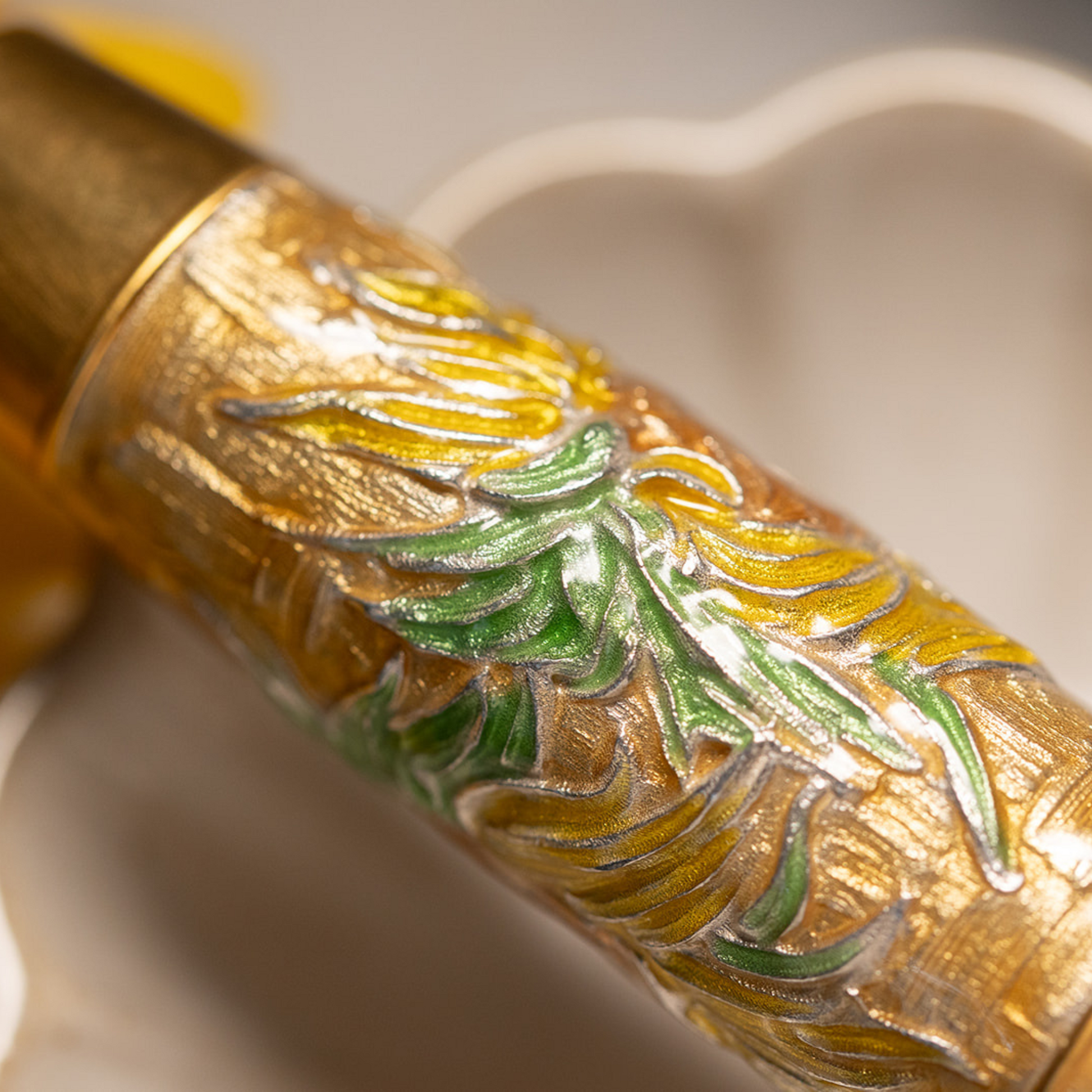 The design of the collection draws inspiration from Van Gogh’s signature impasto technique, where thick layers of oil paint create dynamic movement and depth. To replicate this texture, the barrel and cap of the Dreaming Sunflowers pen are meticulously crafted in micro-casted silver (lost-wax technique) sculpted to achieve the intricate ridges and swirls of Van Gogh’s brushstrokes. Over this precious metal base an enamelling in rich shades of orange, yellow, and green is carefully applied, echoing the radiant tones of the Sunflowers series. Each pen is meticulously hand-painted, making every piece truly one of a kind.