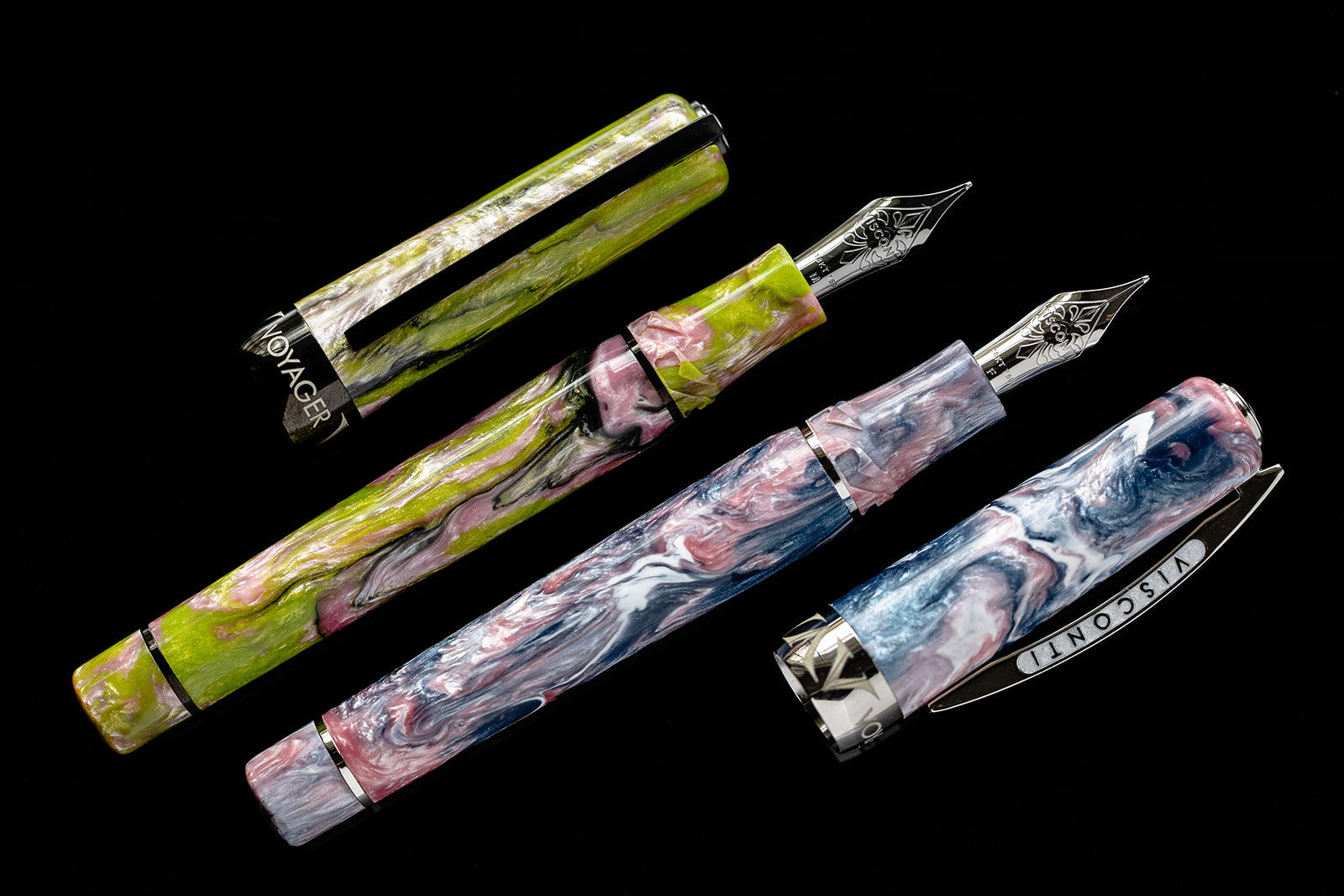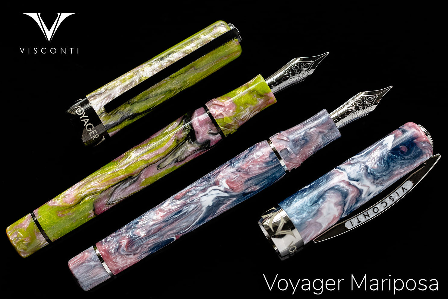 Visconti celebrates the colorful beauty and mystery of the butterfly with the 'Voyager Mariposa.' Two spectacular new resins have been selected for their irresistible display of vibrant, shimmering colors that mimic the colorful display of a butterfly wing: Malachite and Painted Beauty. The Voyager Mariposa is offered in two unique resins:
