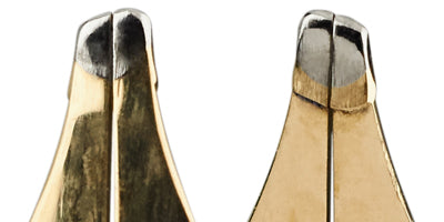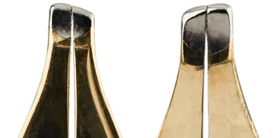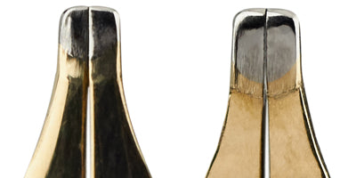 A resize is necessary when the existing tipping is not as broad as that which is desired. For example, a customer would like to go from a Medium to a Broad or wider nib. In cases such as this, the existing tipping has to be physically removed and a new pellet must be welded onto the tines to accommodate the new tip. Any broader customization will require a resize.